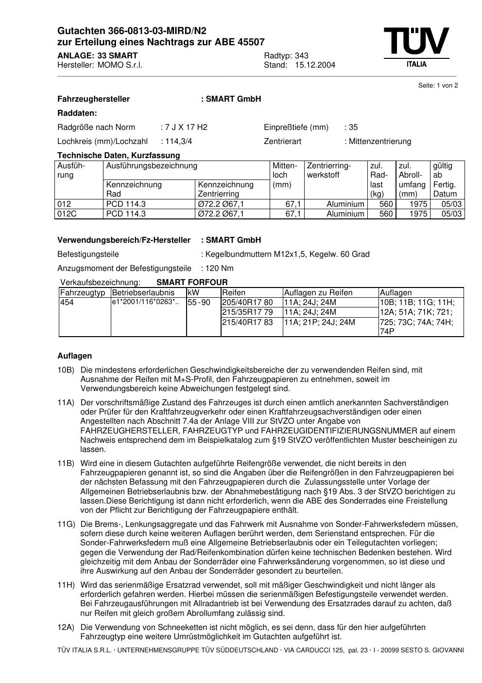 Dieses Gutachten (abe) bezieht sich auf die Alufelge brand-momo 343 in der Ausführung 7Jx17 ET 0, Mittenloch 0 mm (KBA 45507). Im PDF findest du typischerweise zulässige Reifengrößen, Auflagen/Anbauhinweise und – je nach Dokument – Hinweise zur Eintragung.
