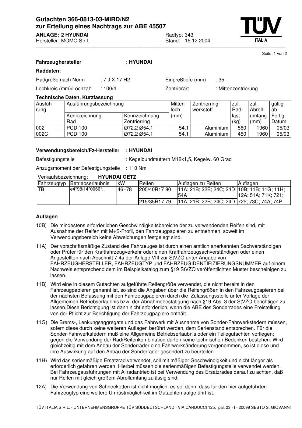 Dieses Gutachten (abe) bezieht sich auf die Alufelge brand-momo 343 in der Ausführung 7Jx17 ET 0, Mittenloch 0 mm (KBA 45507). Im PDF findest du typischerweise zulässige Reifengrößen, Auflagen/Anbauhinweise und – je nach Dokument – Hinweise zur Eintragung.