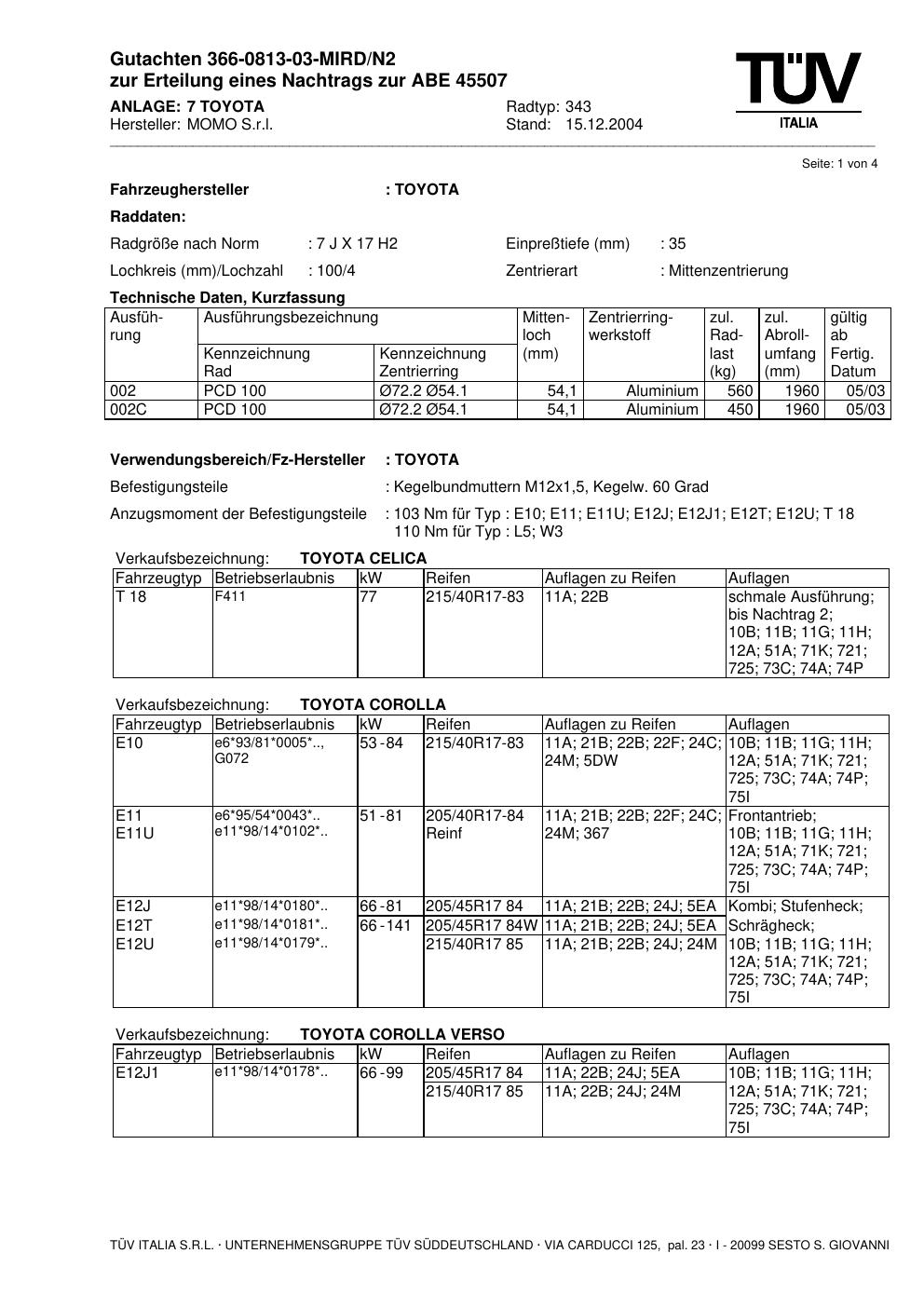 Dieses Gutachten (abe) bezieht sich auf die Alufelge brand-momo 343 in der Ausführung 7Jx17 ET 0, Mittenloch 0 mm (KBA 45507). Im PDF findest du typischerweise zulässige Reifengrößen, Auflagen/Anbauhinweise und – je nach Dokument – Hinweise zur Eintragung.