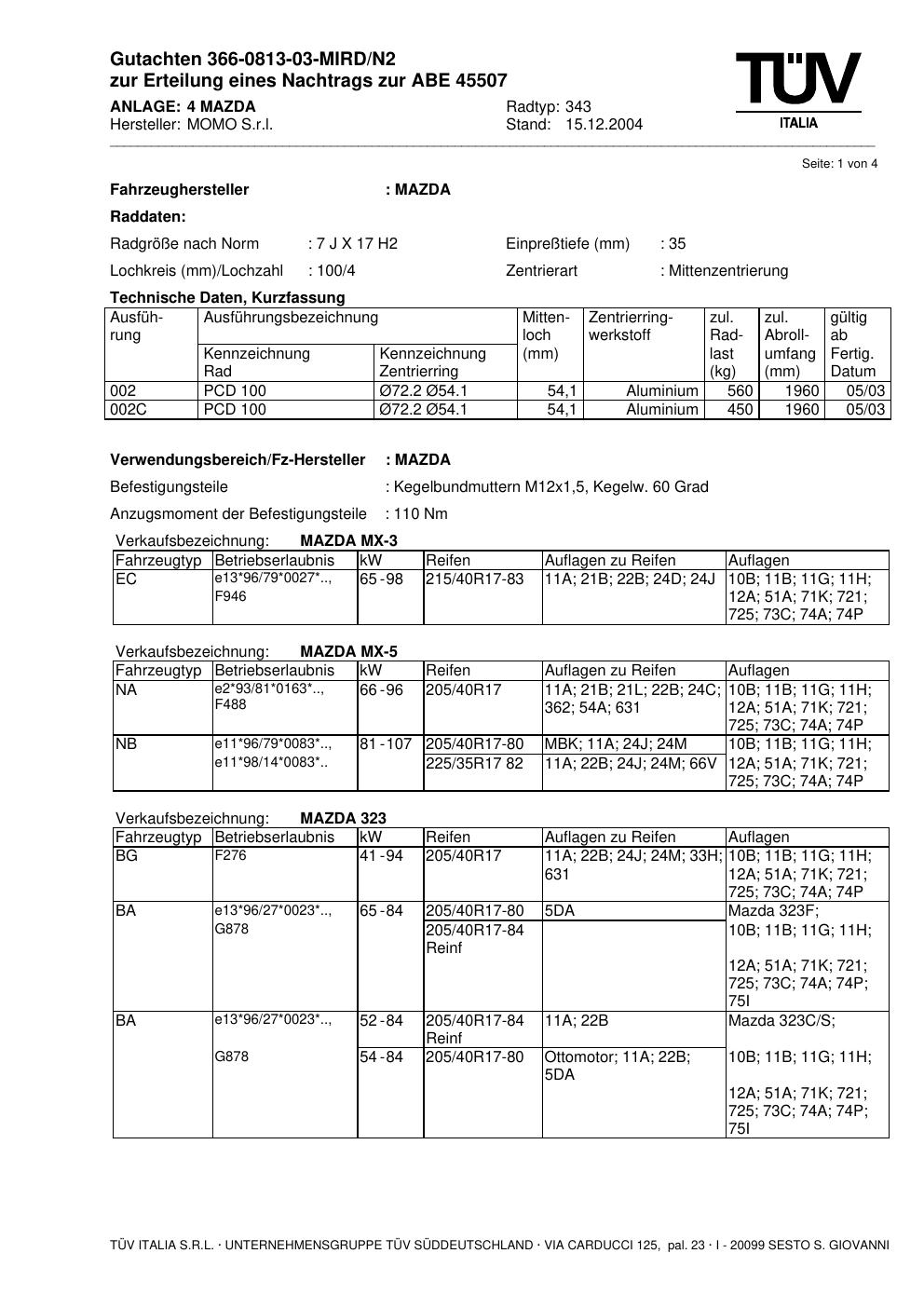 Dieses Gutachten (abe) bezieht sich auf die Alufelge brand-momo 343 in der Ausführung 7Jx17 ET 0, Mittenloch 0 mm (KBA 45507). Im PDF findest du typischerweise zulässige Reifengrößen, Auflagen/Anbauhinweise und – je nach Dokument – Hinweise zur Eintragung.
