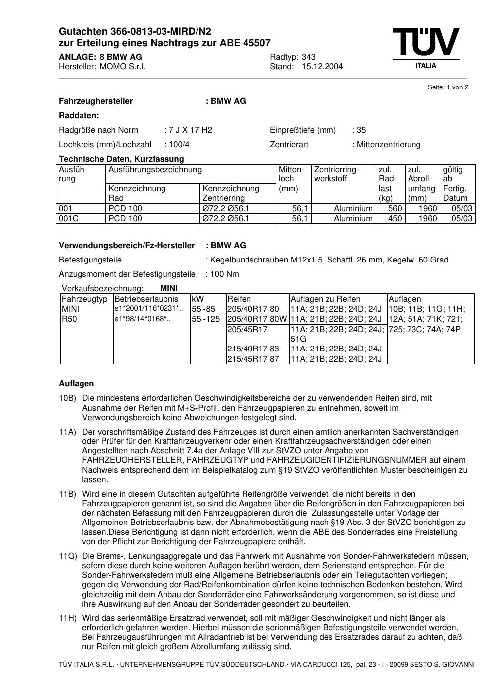 Dieses Gutachten (abe) bezieht sich auf die Alufelge brand-momo 343 in der Ausführung 7Jx17 ET 0, Mittenloch 0 mm (KBA 45507). Im PDF findest du typischerweise zulässige Reifengrößen, Auflagen/Anbauhinweise und – je nach Dokument – Hinweise zur Eintragung.
