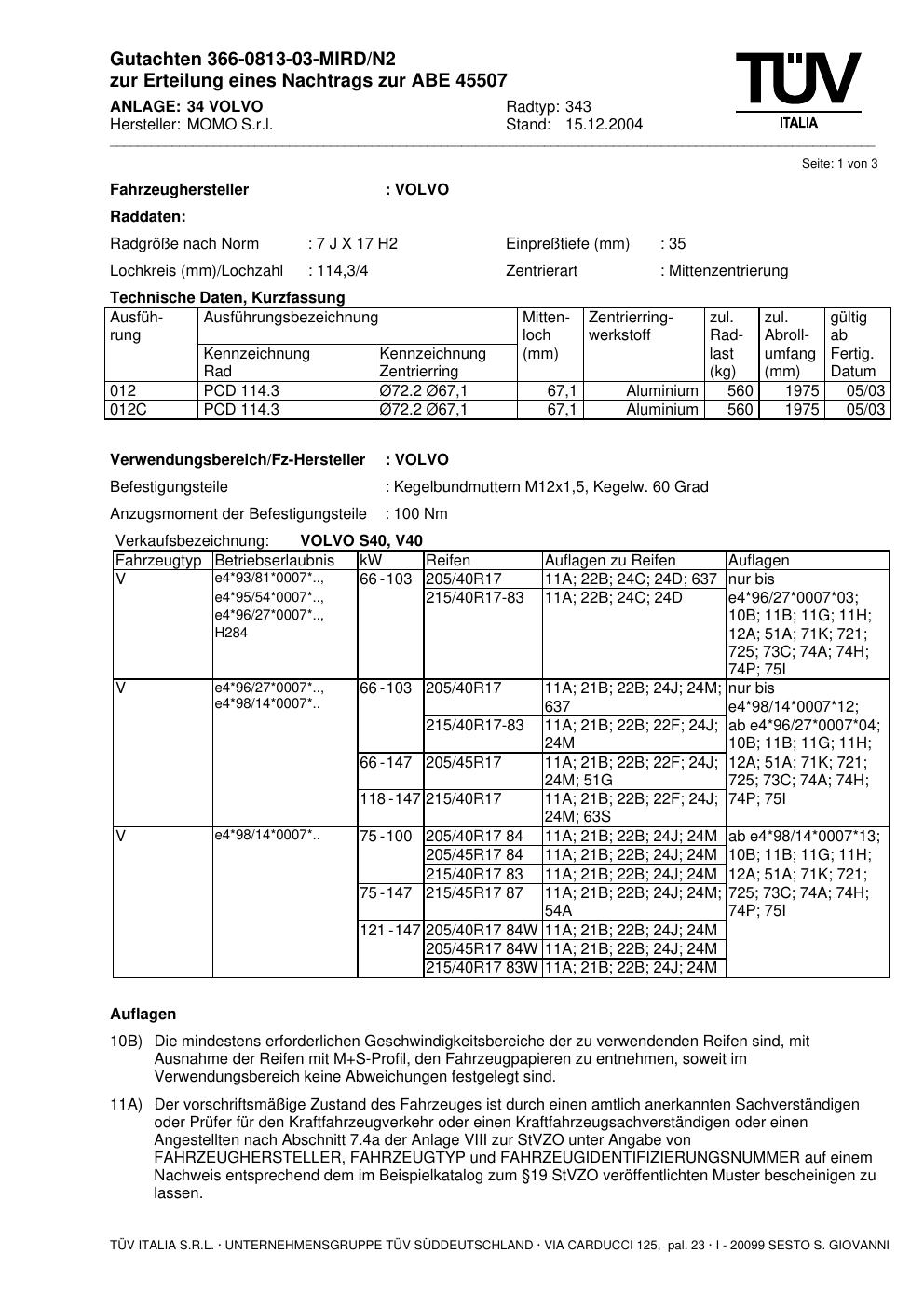 Dieses Gutachten (abe) bezieht sich auf die Alufelge brand-momo 343 in der Ausführung 7Jx17 ET 0, Mittenloch 0 mm (KBA 45507). Im PDF findest du typischerweise zulässige Reifengrößen, Auflagen/Anbauhinweise und – je nach Dokument – Hinweise zur Eintragung.