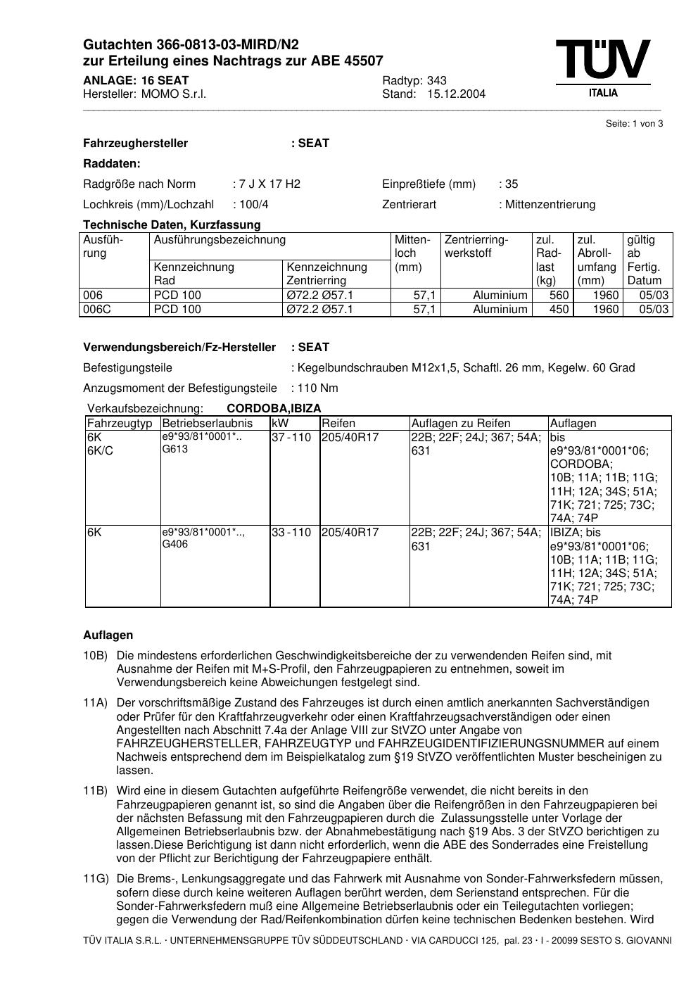 Dieses Gutachten (abe) bezieht sich auf die Alufelge brand-momo 343 in der Ausführung 7Jx17 ET 0, Mittenloch 0 mm (KBA 45507). Im PDF findest du typischerweise zulässige Reifengrößen, Auflagen/Anbauhinweise und – je nach Dokument – Hinweise zur Eintragung.