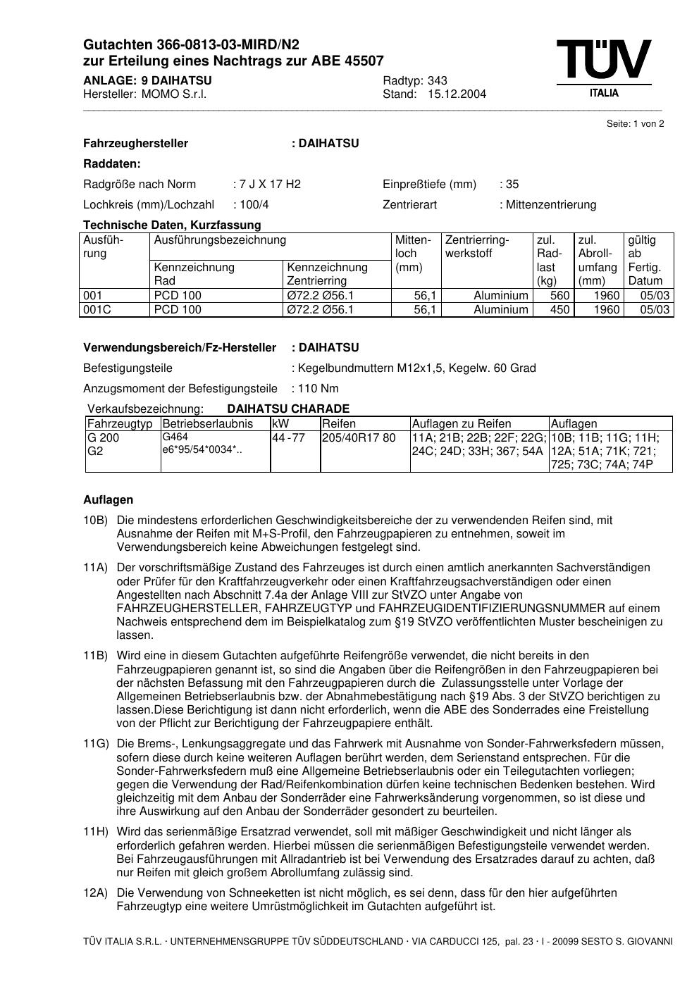 Dieses Gutachten (abe) bezieht sich auf die Alufelge brand-momo 343 in der Ausführung 7Jx17 ET 0, Mittenloch 0 mm (KBA 45507). Im PDF findest du typischerweise zulässige Reifengrößen, Auflagen/Anbauhinweise und – je nach Dokument – Hinweise zur Eintragung.
