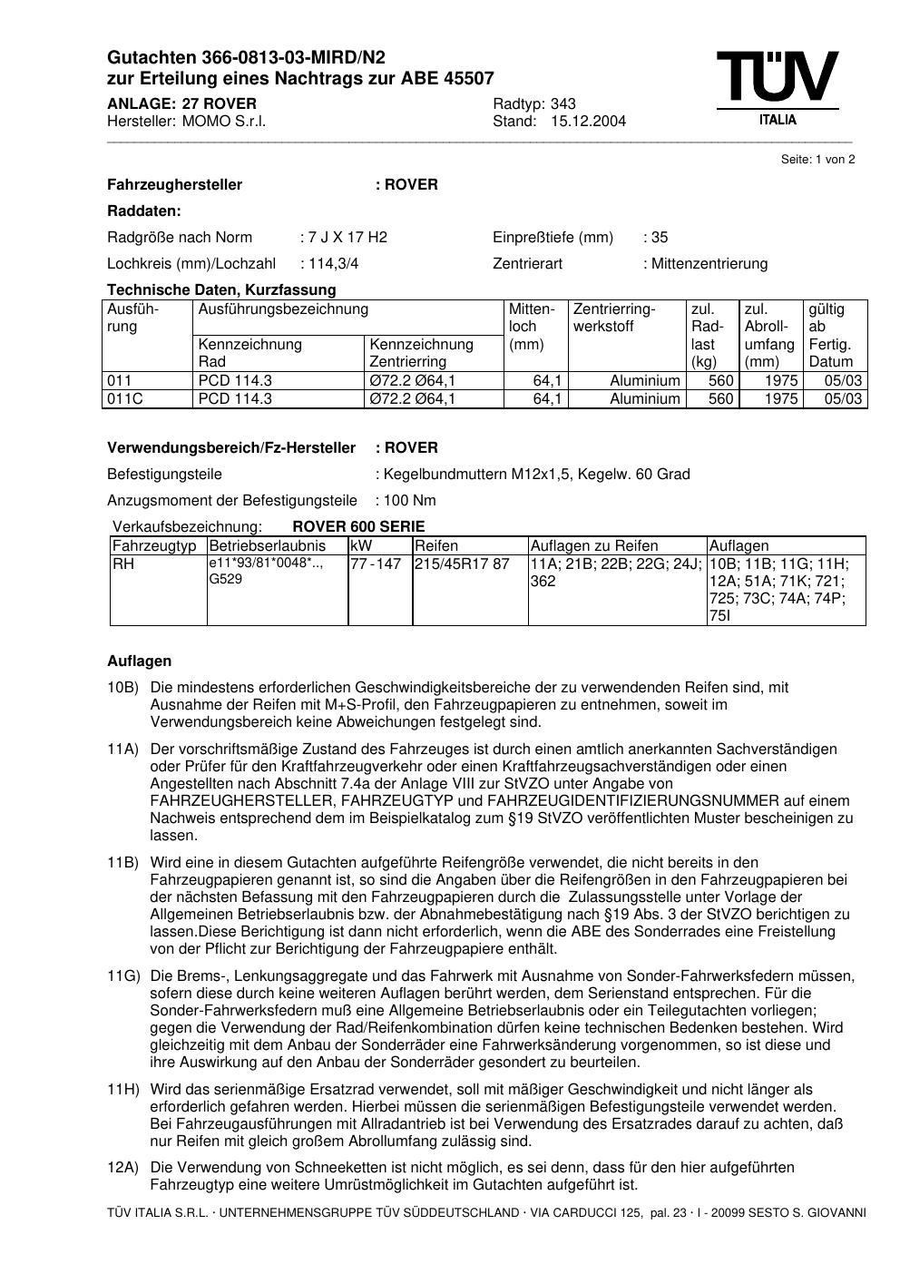 Dieses Gutachten (abe) bezieht sich auf die Alufelge brand-momo 343 in der Ausführung 7Jx17 ET 0, Mittenloch 0 mm (KBA 45507). Im PDF findest du typischerweise zulässige Reifengrößen, Auflagen/Anbauhinweise und – je nach Dokument – Hinweise zur Eintragung.