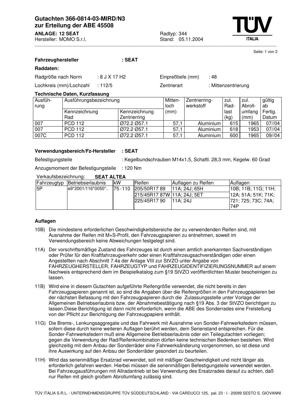 Dieses Gutachten (abe) bezieht sich auf die Alufelge brand-momo 344 in der Ausführung 8Jx17 ET 0, Mittenloch 0 mm (KBA 45508). Im PDF findest du typischerweise zulässige Reifengrößen, Auflagen/Anbauhinweise und – je nach Dokument – Hinweise zur Eintragung.