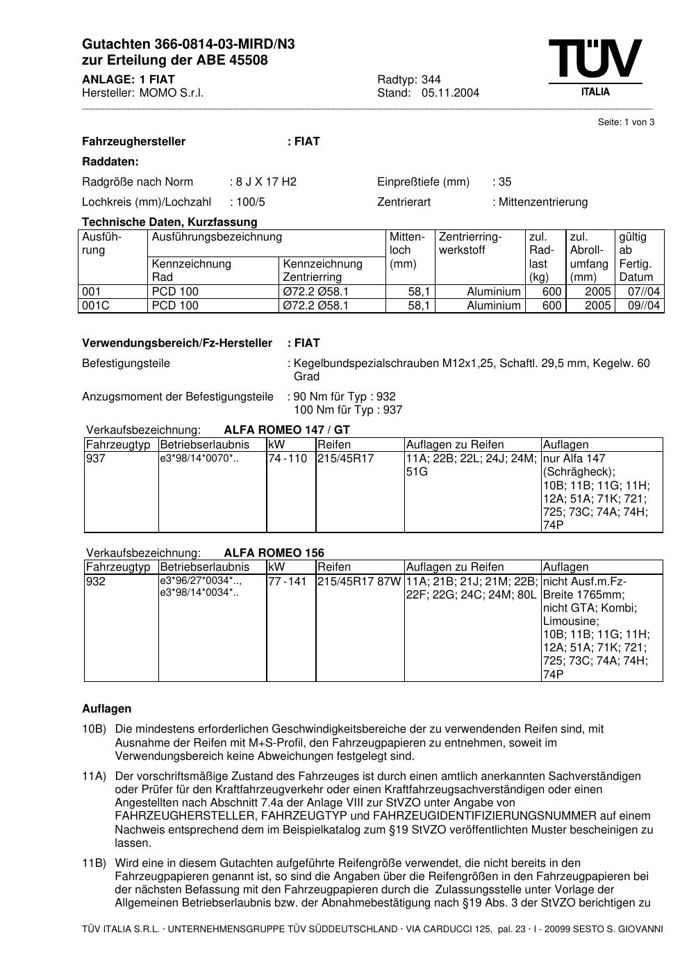 Dieses Gutachten (abe) bezieht sich auf die Alufelge brand-momo 344 in der Ausführung 8Jx17 ET 0, Mittenloch 0 mm (KBA 45508). Im PDF findest du typischerweise zulässige Reifengrößen, Auflagen/Anbauhinweise und – je nach Dokument – Hinweise zur Eintragung.