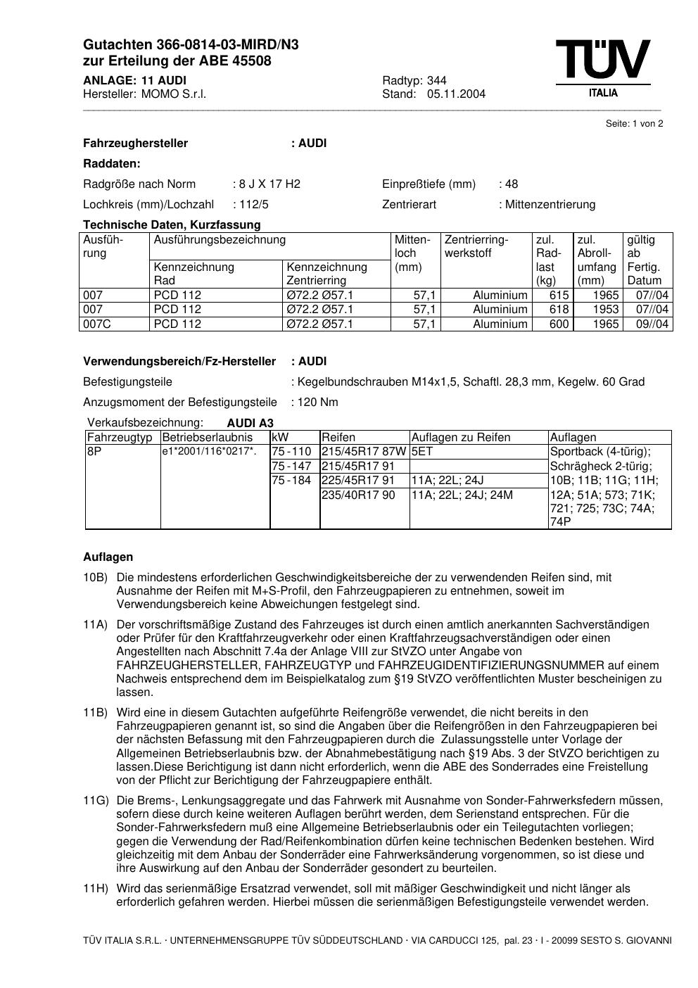 Dieses Gutachten (abe) bezieht sich auf die Alufelge brand-momo 344 in der Ausführung 8Jx17 ET 0, Mittenloch 0 mm (KBA 45508). Im PDF findest du typischerweise zulässige Reifengrößen, Auflagen/Anbauhinweise und – je nach Dokument – Hinweise zur Eintragung.
