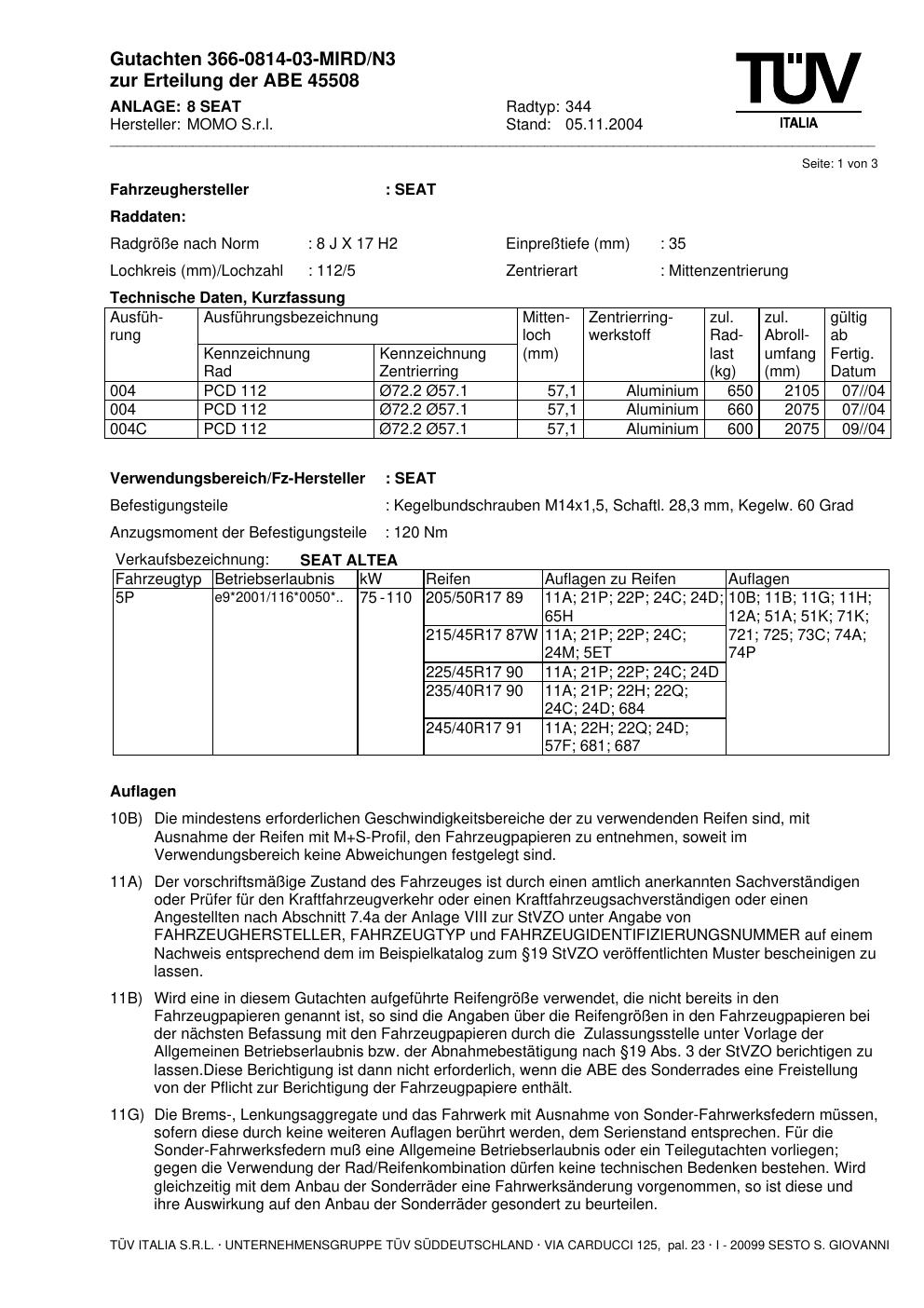 Dieses Gutachten (abe) bezieht sich auf die Alufelge brand-momo 344 in der Ausführung 8Jx17 ET 0, Mittenloch 0 mm (KBA 45508). Im PDF findest du typischerweise zulässige Reifengrößen, Auflagen/Anbauhinweise und – je nach Dokument – Hinweise zur Eintragung.