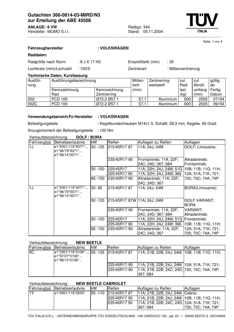 Dieses Gutachten (abe) bezieht sich auf die Alufelge brand-momo 344 in der Ausführung 8Jx17 ET 0, Mittenloch 0 mm (KBA 45508). Im PDF findest du typischerweise zulässige Reifengrößen, Auflagen/Anbauhinweise und – je nach Dokument – Hinweise zur Eintragung.