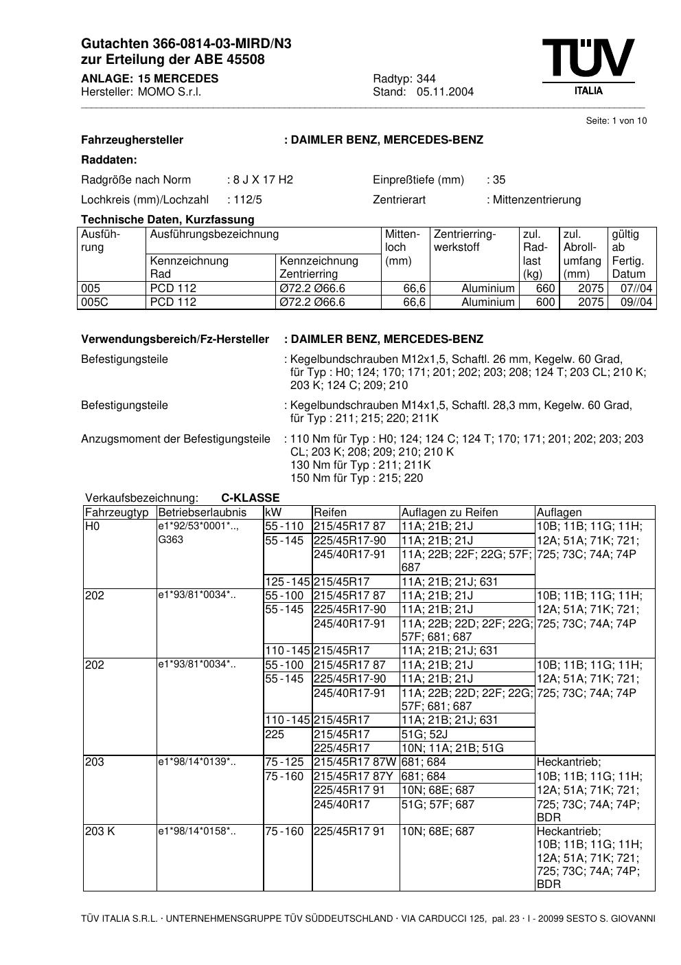 Dieses Gutachten (abe) bezieht sich auf die Alufelge brand-momo 344 in der Ausführung 8Jx17 ET 0, Mittenloch 0 mm (KBA 45508). Im PDF findest du typischerweise zulässige Reifengrößen, Auflagen/Anbauhinweise und – je nach Dokument – Hinweise zur Eintragung.