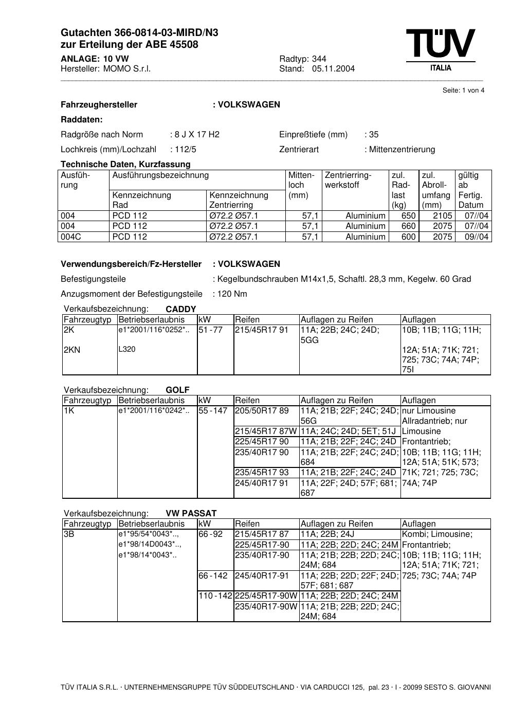 Dieses Gutachten (abe) bezieht sich auf die Alufelge brand-momo 344 in der Ausführung 8Jx17 ET 0, Mittenloch 0 mm (KBA 45508). Im PDF findest du typischerweise zulässige Reifengrößen, Auflagen/Anbauhinweise und – je nach Dokument – Hinweise zur Eintragung.