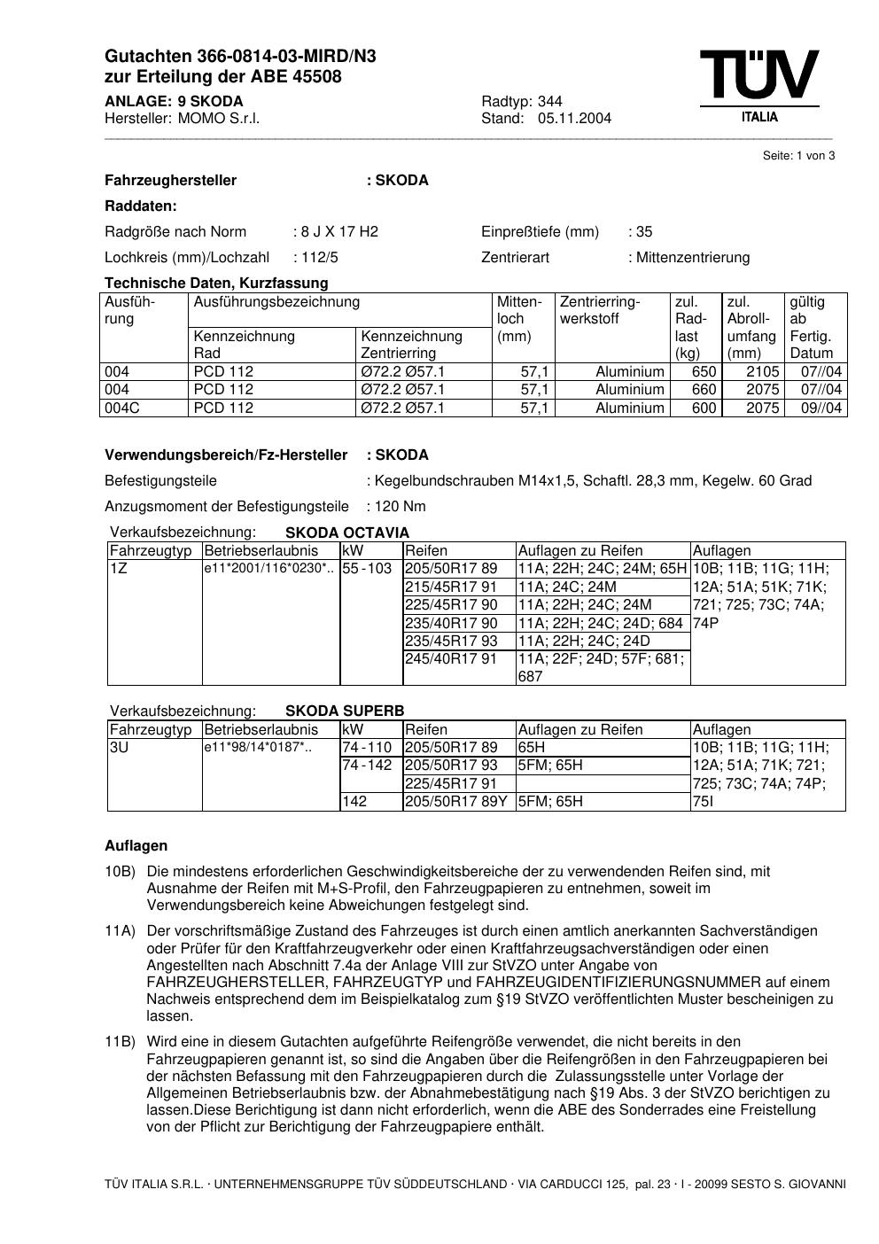 Dieses Gutachten (abe) bezieht sich auf die Alufelge brand-momo 344 in der Ausführung 8Jx17 ET 0, Mittenloch 0 mm (KBA 45508). Im PDF findest du typischerweise zulässige Reifengrößen, Auflagen/Anbauhinweise und – je nach Dokument – Hinweise zur Eintragung.