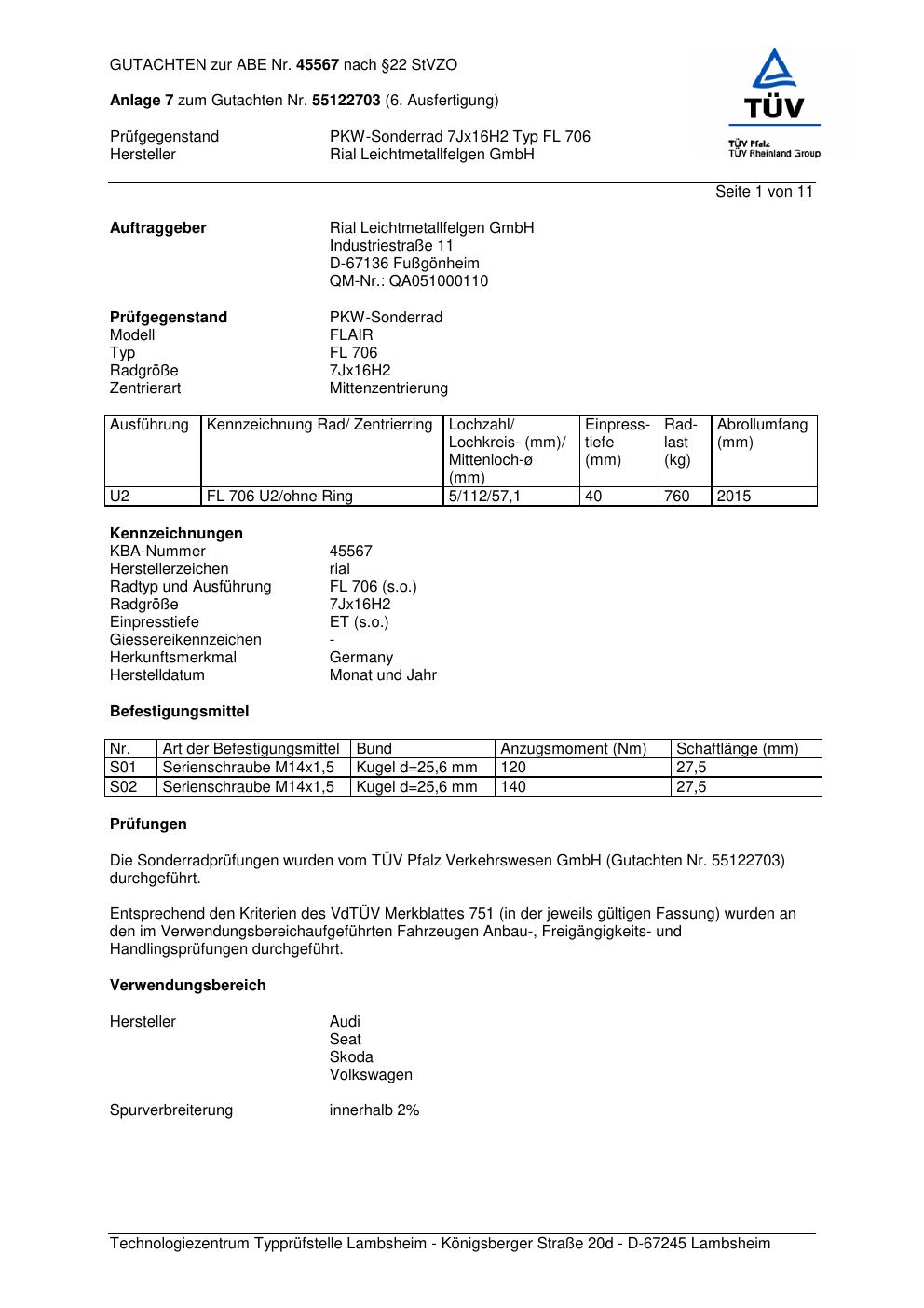 Dieses Gutachten (abe) bezieht sich auf die Alufelge brand-rial FL 706 in der Ausführung 7Jx16 ET 0, Mittenloch 0 mm (KBA 45567). Im PDF findest du typischerweise zulässige Reifengrößen, Auflagen/Anbauhinweise und – je nach Dokument – Hinweise zur Eintragung.
