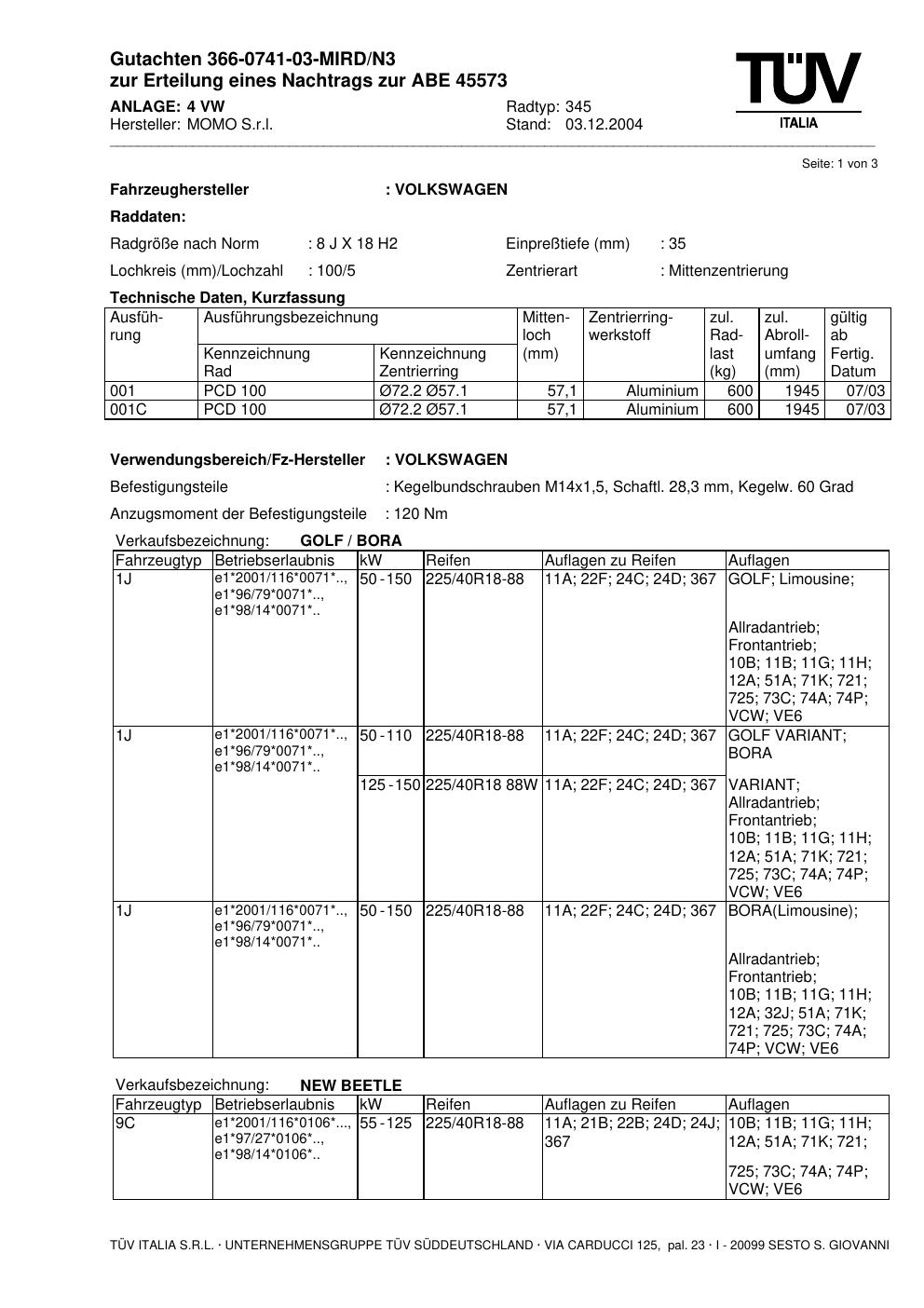 Dieses Gutachten (abe) bezieht sich auf die Alufelge brand-momo 345 in der Ausführung 8Jx18 ET 0, Mittenloch 0 mm (KBA 45573). Im PDF findest du typischerweise zulässige Reifengrößen, Auflagen/Anbauhinweise und – je nach Dokument – Hinweise zur Eintragung.