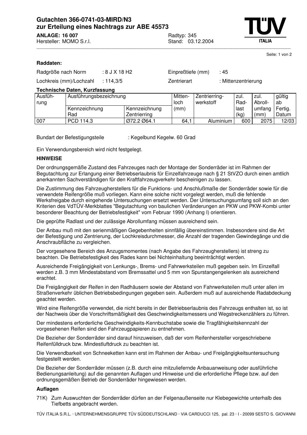Dieses Gutachten (abe) bezieht sich auf die Alufelge brand-momo 345 in der Ausführung 8Jx18 ET 0, Mittenloch 0 mm (KBA 45573). Im PDF findest du typischerweise zulässige Reifengrößen, Auflagen/Anbauhinweise und – je nach Dokument – Hinweise zur Eintragung.