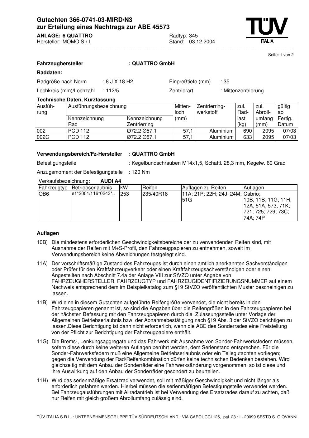 Dieses Gutachten (abe) bezieht sich auf die Alufelge brand-momo 345 in der Ausführung 8Jx18 ET 0, Mittenloch 0 mm (KBA 45573). Im PDF findest du typischerweise zulässige Reifengrößen, Auflagen/Anbauhinweise und – je nach Dokument – Hinweise zur Eintragung.