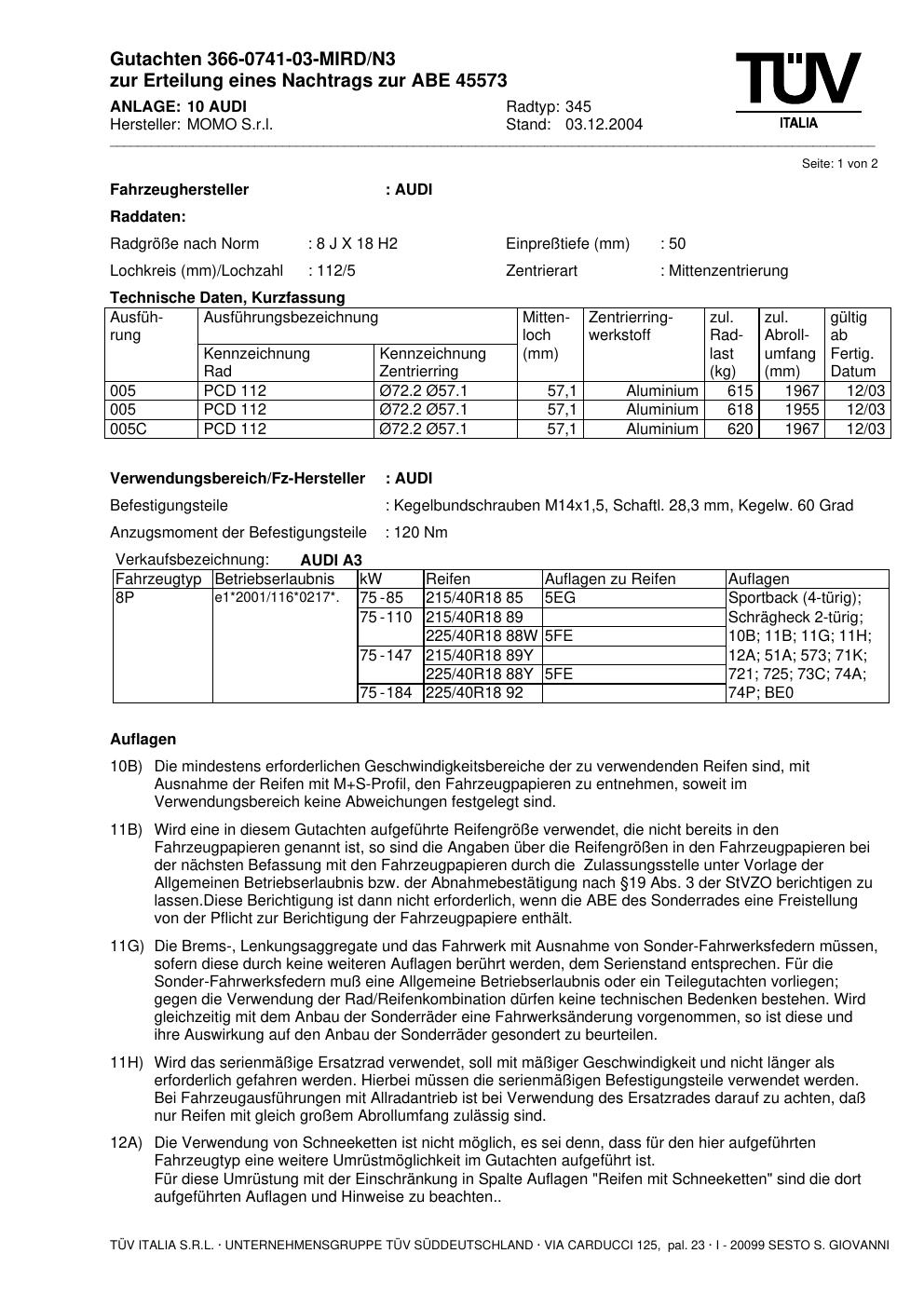 Dieses Gutachten (abe) bezieht sich auf die Alufelge brand-momo 345 in der Ausführung 8Jx18 ET 0, Mittenloch 0 mm (KBA 45573). Im PDF findest du typischerweise zulässige Reifengrößen, Auflagen/Anbauhinweise und – je nach Dokument – Hinweise zur Eintragung.