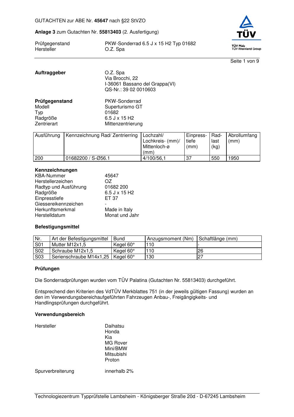 Felgengutachten / abe für Alufelgen ATS 0168 2 (6.5Jx15 ET 0, Mittenloch 0 mm) mit KBA 45647 (Zertifikatsnummer 45647). Hier kostenlos als PDF herunterladen. Der Download-Link ist 24 Stunden gültig und kann bis zu zwei Mal verwendet werden.