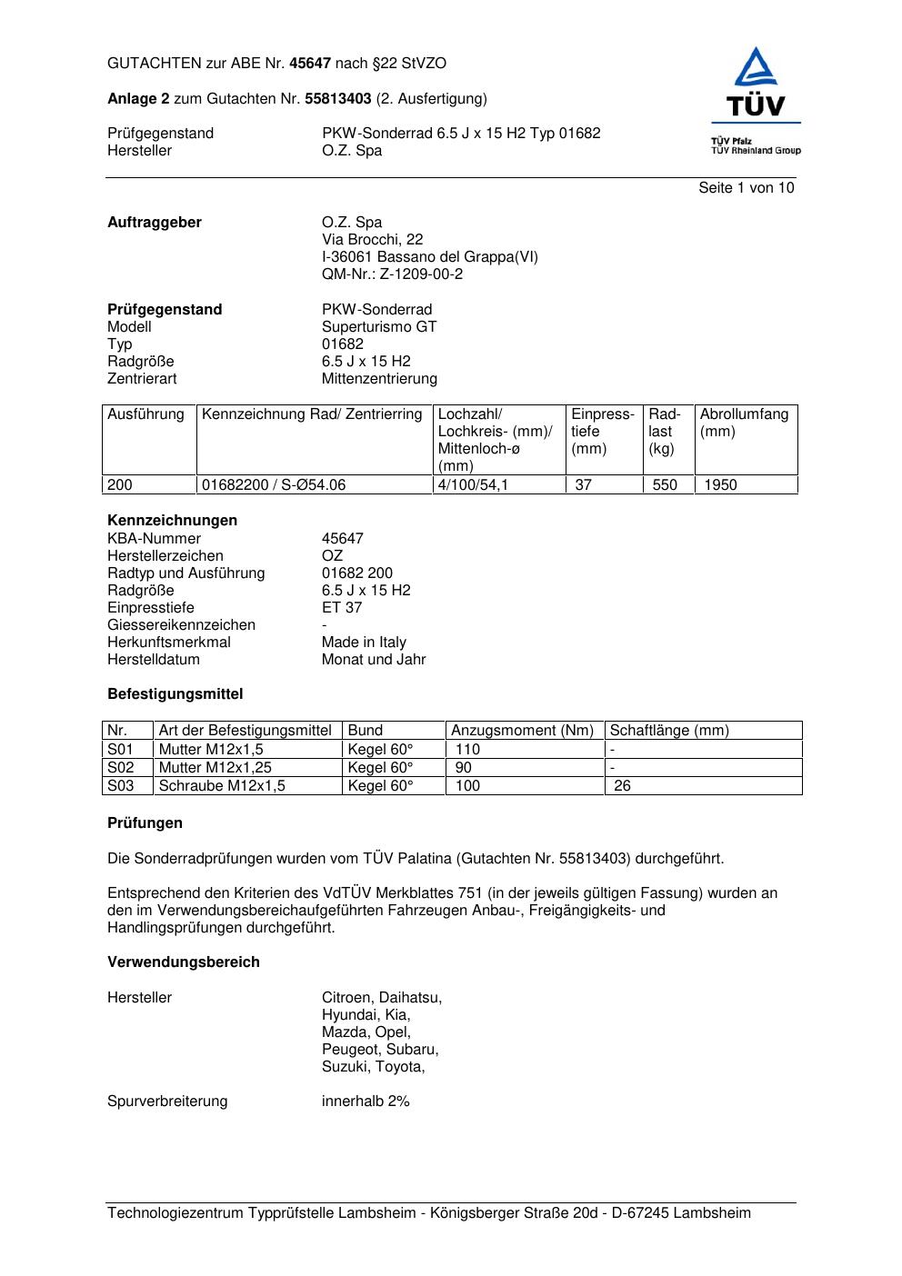 Dieses Gutachten (abe) bezieht sich auf die Alufelge ATS 01682 in der Ausführung 6.5Jx15 ET 0, Mittenloch 0 mm (KBA 45647). Im PDF findest du typischerweise zulässige Reifengrößen, Auflagen/Anbauhinweise und – je nach Dokument – Hinweise zur Eintragung.