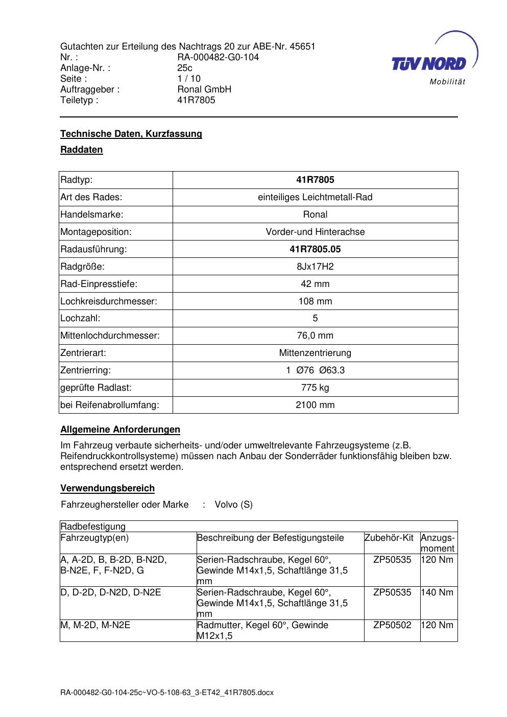 Dieses Gutachten (abe) bezieht sich auf die Alufelge brand-ronal 41R7805 in der Ausführung 8Jx17 ET 0, Mittenloch 0 mm (KBA 45651). Im PDF findest du typischerweise zulässige Reifengrößen, Auflagen/Anbauhinweise und – je nach Dokument – Hinweise zur Eintragung.
