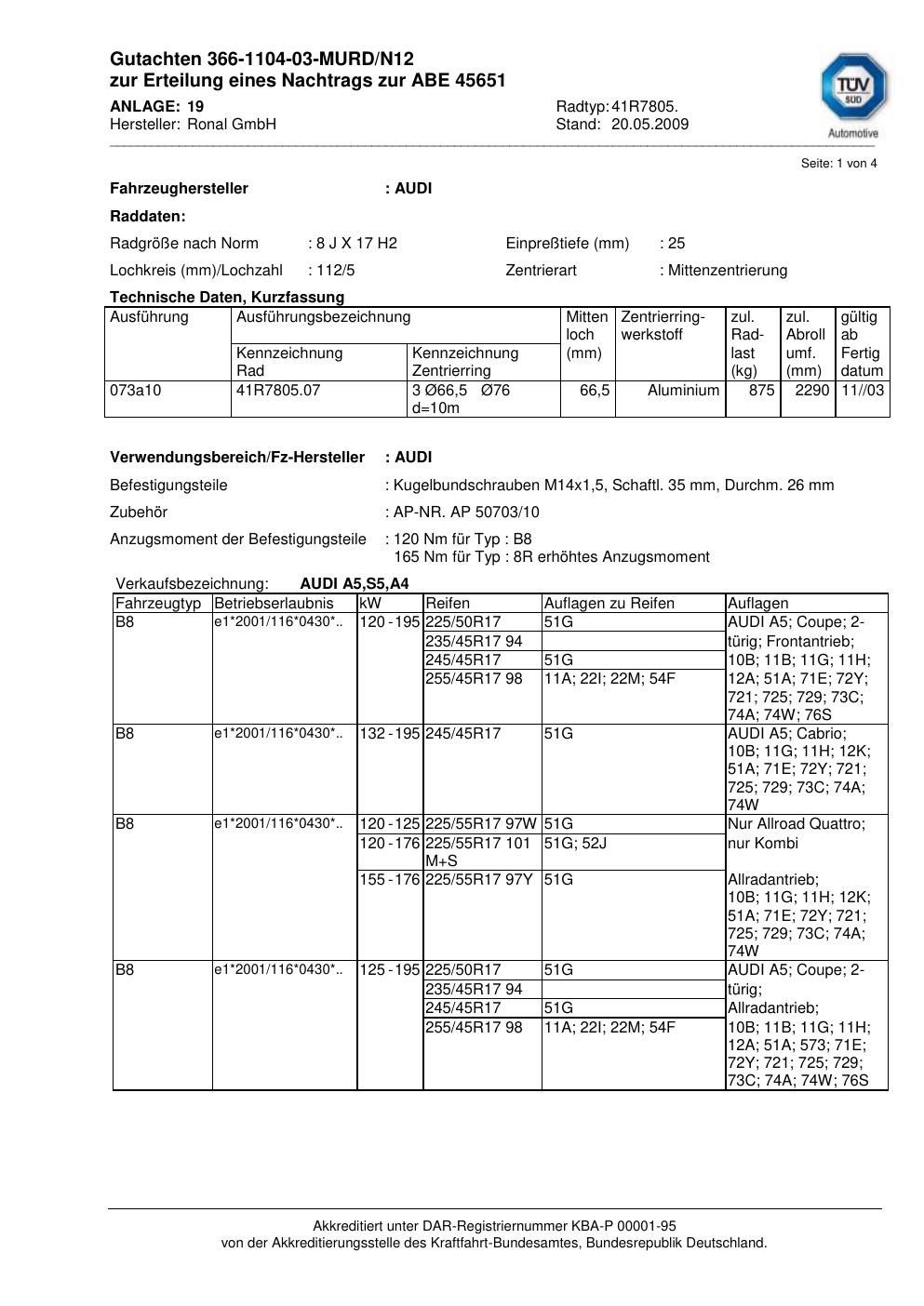Dieses Gutachten (abe) bezieht sich auf die Alufelge brand-ronal 41R7805 in der Ausführung 8Jx17 ET 0, Mittenloch 0 mm (KBA 45651). Im PDF findest du typischerweise zulässige Reifengrößen, Auflagen/Anbauhinweise und – je nach Dokument – Hinweise zur Eintragung.