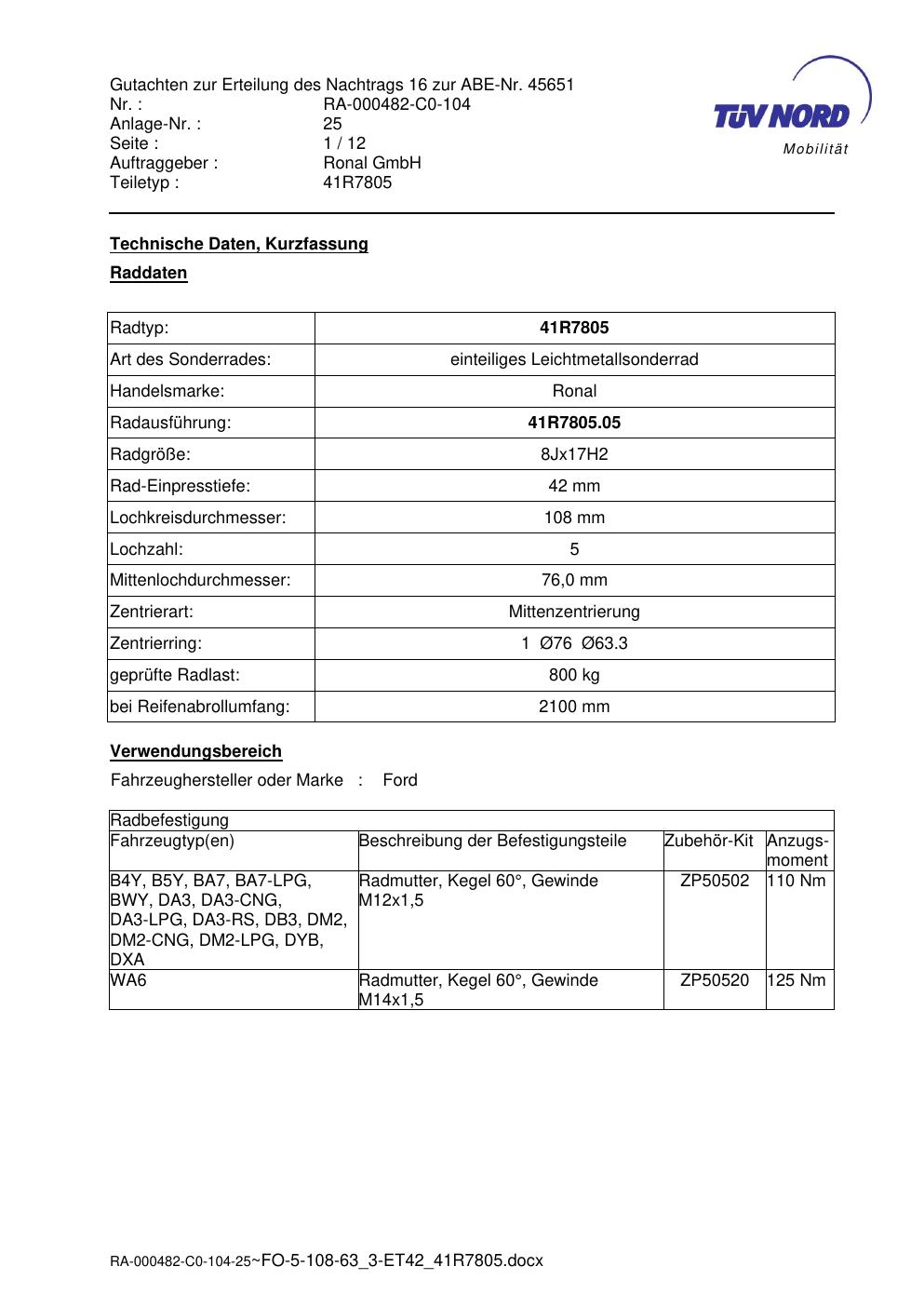 Dieses Gutachten (abe) bezieht sich auf die Alufelge brand-ronal 41R7805 in der Ausführung 8Jx17 ET 0, Mittenloch 0 mm (KBA 45651). Im PDF findest du typischerweise zulässige Reifengrößen, Auflagen/Anbauhinweise und – je nach Dokument – Hinweise zur Eintragung.