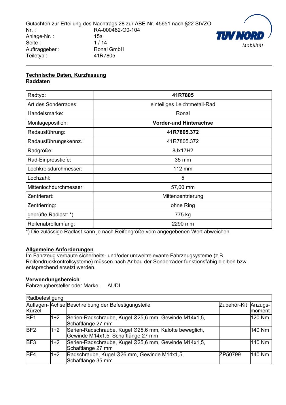 Dieses Gutachten (abe) bezieht sich auf die Alufelge brand-ronal 41R7805 in der Ausführung 8Jx17 ET 0, Mittenloch 0 mm (KBA 45651). Im PDF findest du typischerweise zulässige Reifengrößen, Auflagen/Anbauhinweise und – je nach Dokument – Hinweise zur Eintragung.