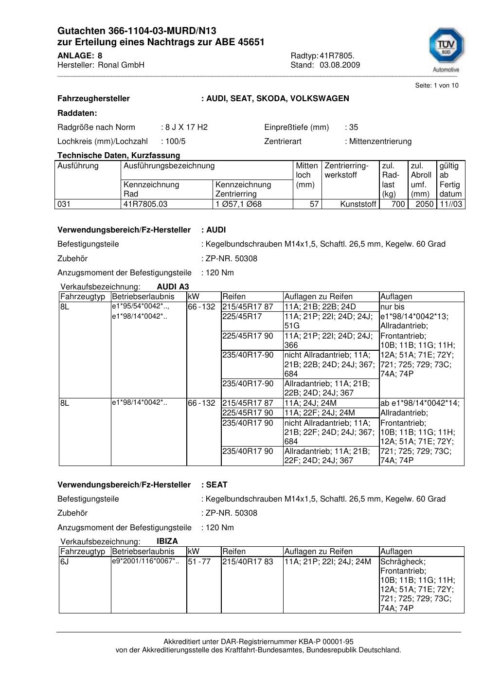 Dieses Gutachten (abe) bezieht sich auf die Alufelge Ronal 41R7805 in der Ausführung 8Jx17 ET 0, Mittenloch 0 mm (KBA 45651). Im PDF findest du typischerweise zulässige Reifengrößen, Auflagen/Anbauhinweise und – je nach Dokument – Hinweise zur Eintragung.