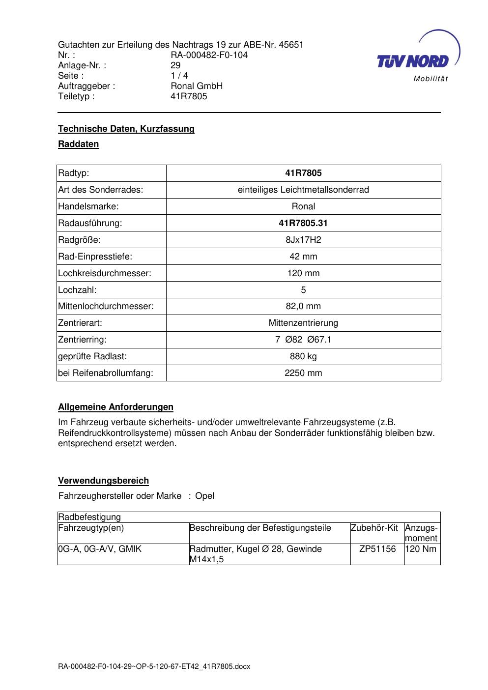 Dieses Gutachten (abe) bezieht sich auf die Alufelge brand-ronal 41R7805 in der Ausführung 8Jx17 ET 0, Mittenloch 0 mm (KBA 45651). Im PDF findest du typischerweise zulässige Reifengrößen, Auflagen/Anbauhinweise und – je nach Dokument – Hinweise zur Eintragung.