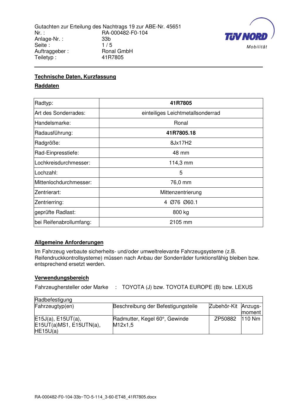 Dieses Gutachten (abe) bezieht sich auf die Alufelge brand-ronal 41R7805 in der Ausführung 8Jx17 ET 0, Mittenloch 0 mm (KBA 45651). Im PDF findest du typischerweise zulässige Reifengrößen, Auflagen/Anbauhinweise und – je nach Dokument – Hinweise zur Eintragung.