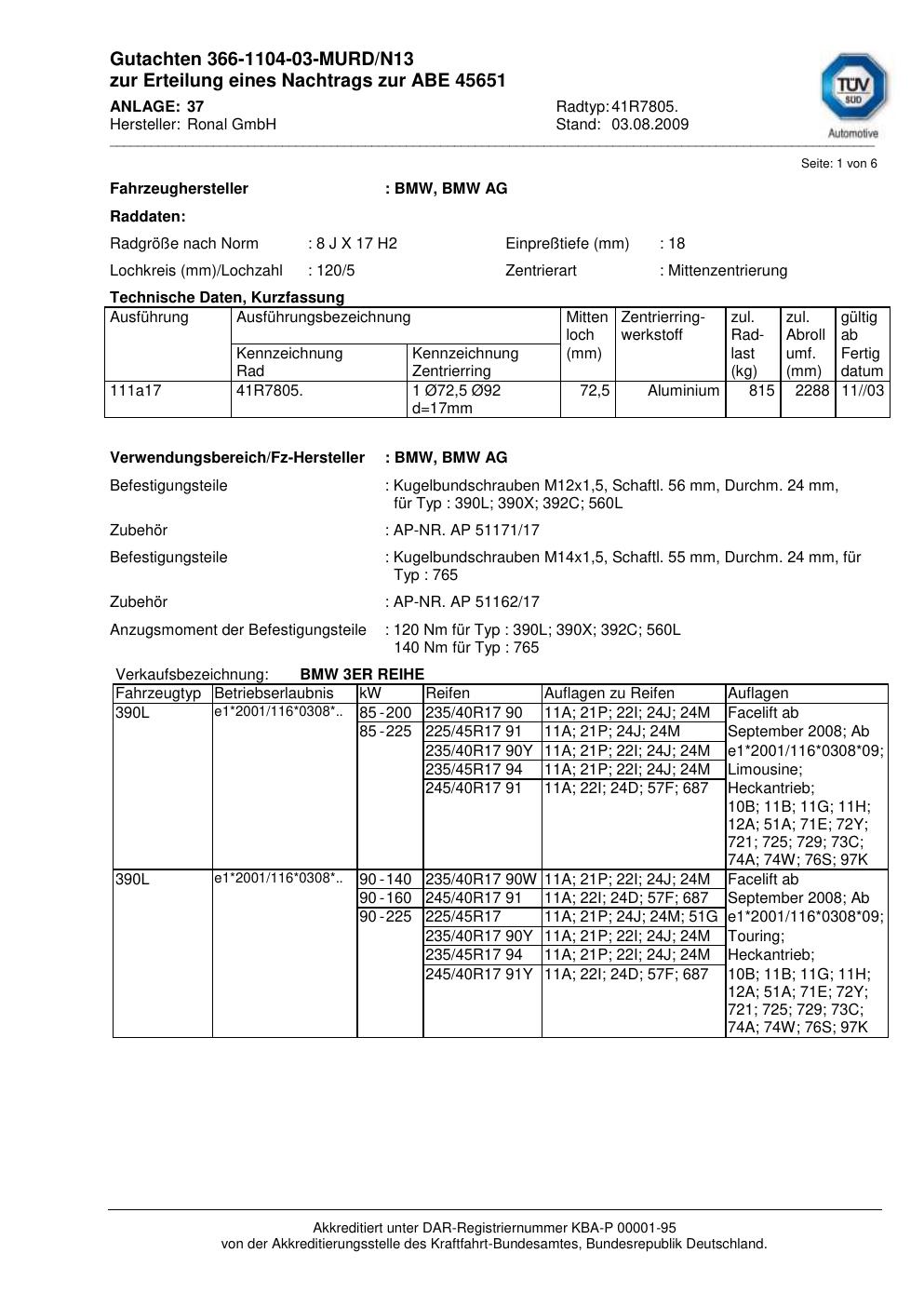 Dieses Gutachten (abe) bezieht sich auf die Alufelge brand-ronal 41R7805 in der Ausführung 8Jx17 ET 0, Mittenloch 0 mm (KBA 45651). Im PDF findest du typischerweise zulässige Reifengrößen, Auflagen/Anbauhinweise und – je nach Dokument – Hinweise zur Eintragung.