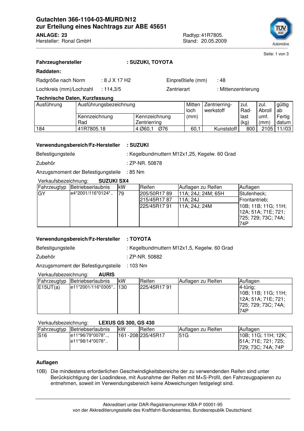 Dieses Gutachten (abe) bezieht sich auf die Alufelge Ronal 41R7805 in der Ausführung 8Jx17 ET 0, Mittenloch 0 mm (KBA 45651). Im PDF findest du typischerweise zulässige Reifengrößen, Auflagen/Anbauhinweise und – je nach Dokument – Hinweise zur Eintragung.
