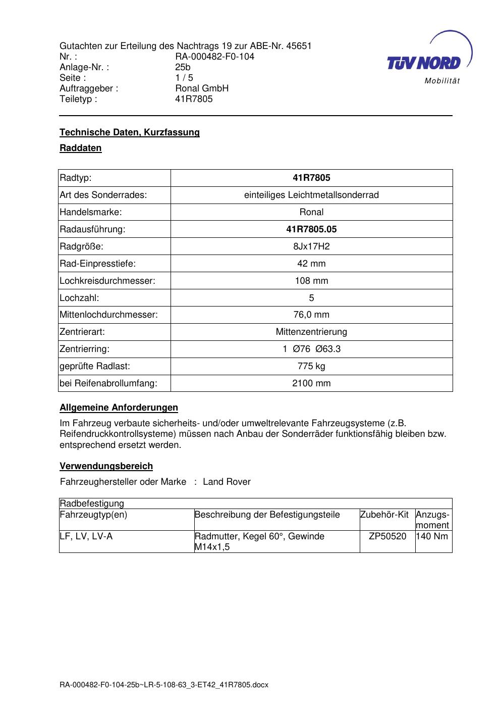 Dieses Gutachten (abe) bezieht sich auf die Alufelge brand-ronal 41R7805 in der Ausführung 8Jx17 ET 0, Mittenloch 0 mm (KBA 45651). Im PDF findest du typischerweise zulässige Reifengrößen, Auflagen/Anbauhinweise und – je nach Dokument – Hinweise zur Eintragung.
