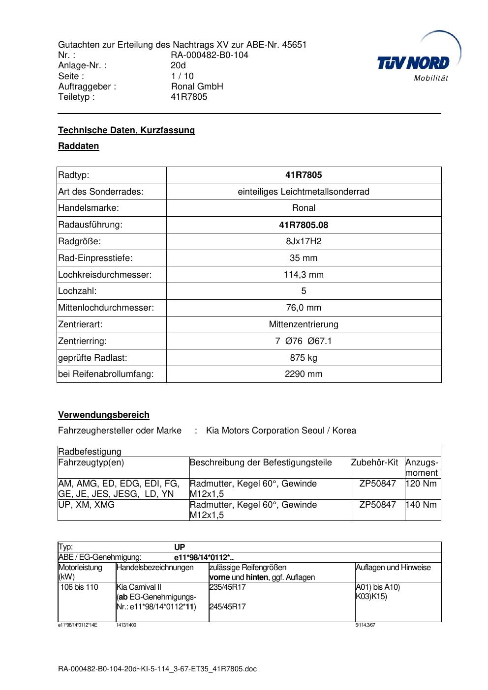 Dieses Gutachten (abe) bezieht sich auf die Alufelge brand-ronal 41R7805 in der Ausführung 8Jx17 ET 0, Mittenloch 0 mm (KBA 45651). Im PDF findest du typischerweise zulässige Reifengrößen, Auflagen/Anbauhinweise und – je nach Dokument – Hinweise zur Eintragung.