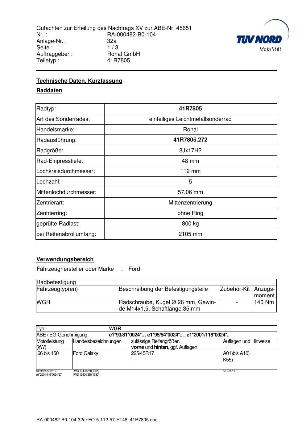 Dieses Gutachten (abe) bezieht sich auf die Alufelge brand-ronal 41R7805 in der Ausführung 8Jx17 ET 0, Mittenloch 0 mm (KBA 45651). Im PDF findest du typischerweise zulässige Reifengrößen, Auflagen/Anbauhinweise und – je nach Dokument – Hinweise zur Eintragung.