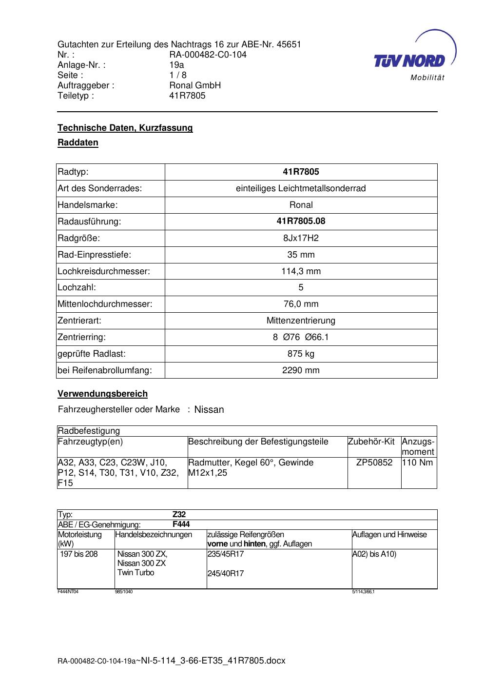 Dieses Gutachten (abe) bezieht sich auf die Alufelge brand-ronal 41R7805 in der Ausführung 8Jx17 ET 0, Mittenloch 0 mm (KBA 45651). Im PDF findest du typischerweise zulässige Reifengrößen, Auflagen/Anbauhinweise und – je nach Dokument – Hinweise zur Eintragung.