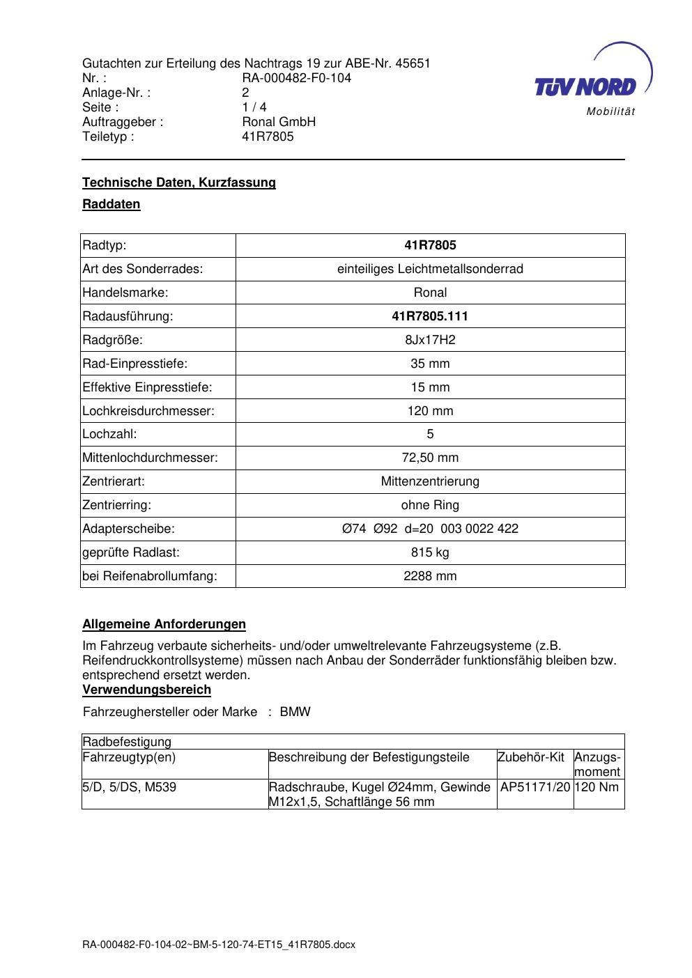 Dieses Gutachten (abe) bezieht sich auf die Alufelge brand-ronal 41R7805 in der Ausführung 8Jx17 ET 0, Mittenloch 0 mm (KBA 45651). Im PDF findest du typischerweise zulässige Reifengrößen, Auflagen/Anbauhinweise und – je nach Dokument – Hinweise zur Eintragung.