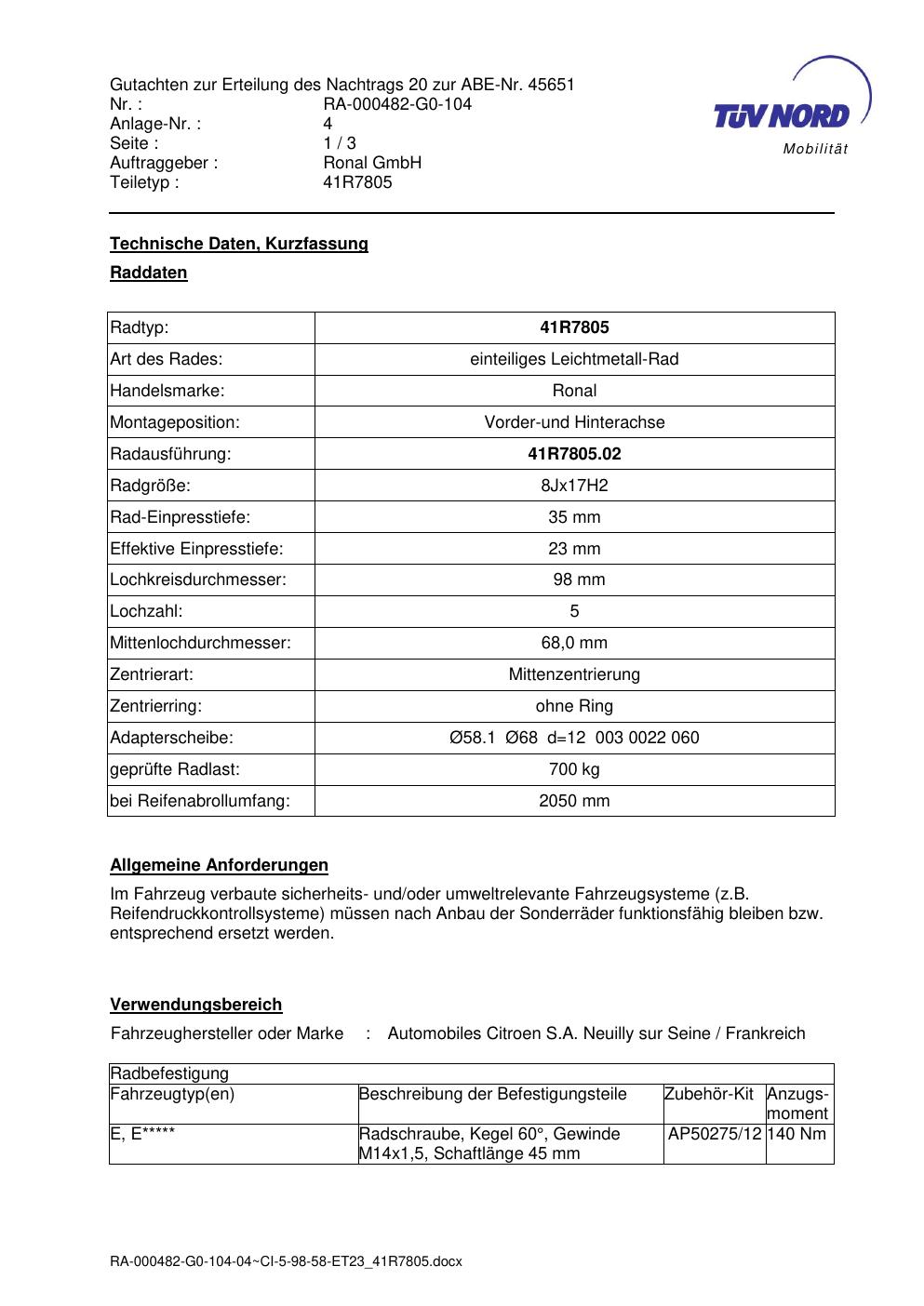 Dieses Gutachten (abe) bezieht sich auf die Alufelge brand-ronal 41R7805 in der Ausführung 8Jx17 ET 0, Mittenloch 0 mm (KBA 45651). Im PDF findest du typischerweise zulässige Reifengrößen, Auflagen/Anbauhinweise und – je nach Dokument – Hinweise zur Eintragung.