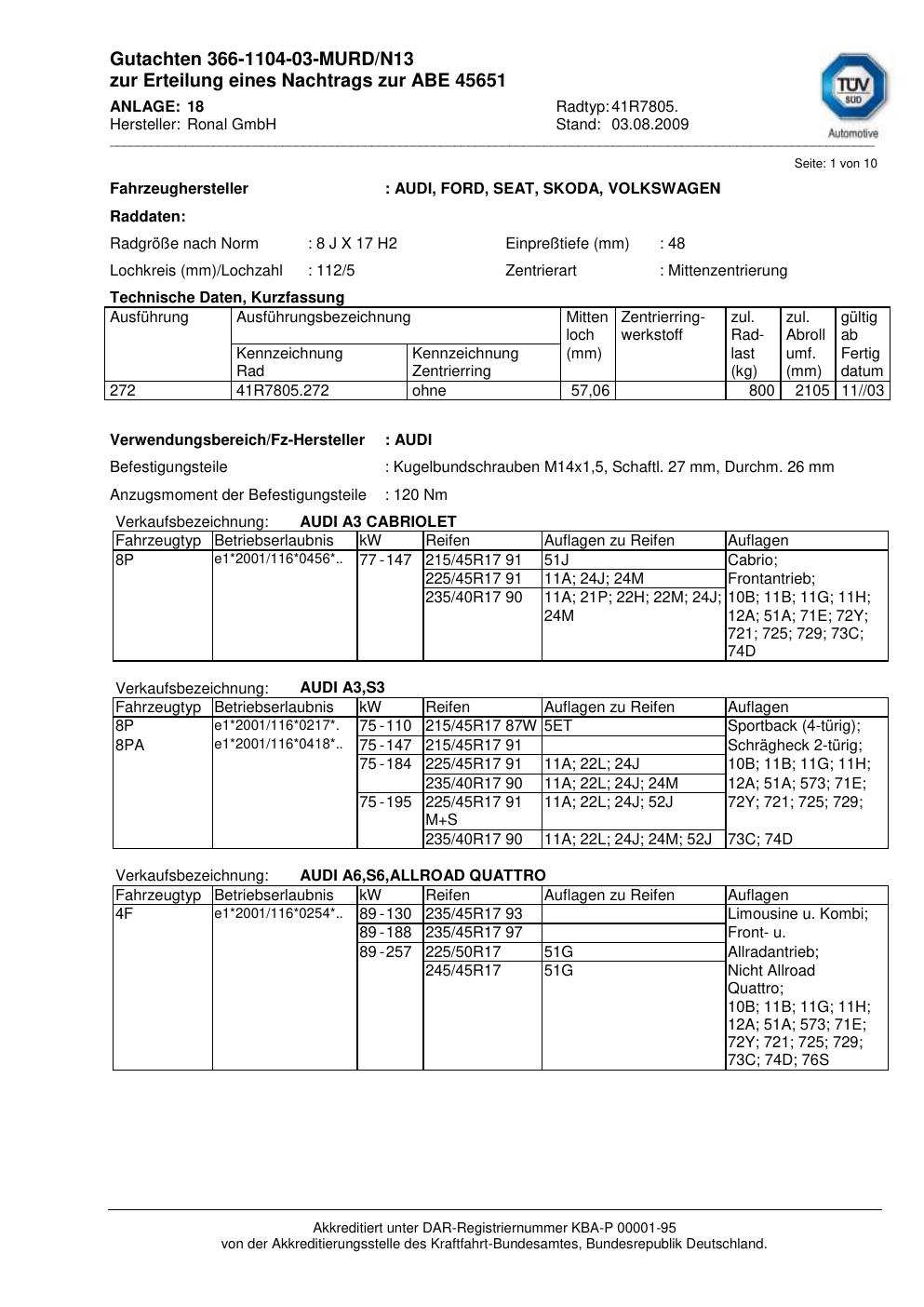 Dieses Gutachten (abe) bezieht sich auf die Alufelge Ronal 41R7805 in der Ausführung 8Jx17 ET 0, Mittenloch 0 mm (KBA 45651). Im PDF findest du typischerweise zulässige Reifengrößen, Auflagen/Anbauhinweise und – je nach Dokument – Hinweise zur Eintragung.