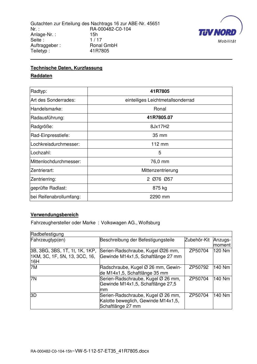 Dieses Gutachten (abe) bezieht sich auf die Alufelge brand-ronal 41R7805 in der Ausführung 8Jx17 ET 0, Mittenloch 0 mm (KBA 45651). Im PDF findest du typischerweise zulässige Reifengrößen, Auflagen/Anbauhinweise und – je nach Dokument – Hinweise zur Eintragung.