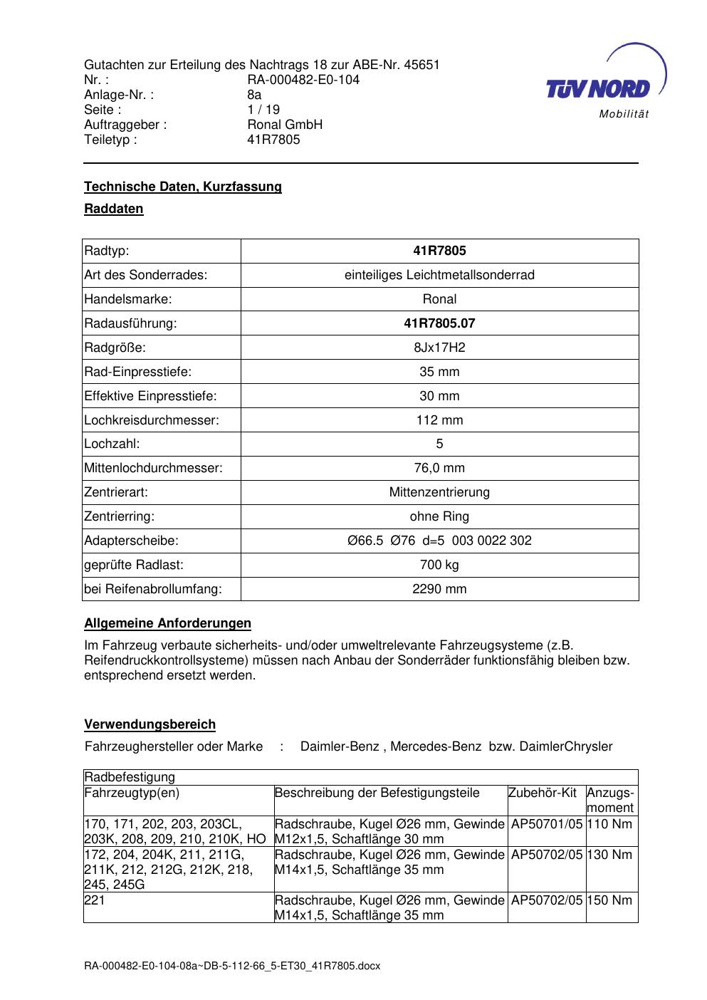 Dieses Gutachten (abe) bezieht sich auf die Alufelge brand-ronal 41R7805 in der Ausführung 8Jx17 ET 0, Mittenloch 0 mm (KBA 45651). Im PDF findest du typischerweise zulässige Reifengrößen, Auflagen/Anbauhinweise und – je nach Dokument – Hinweise zur Eintragung.