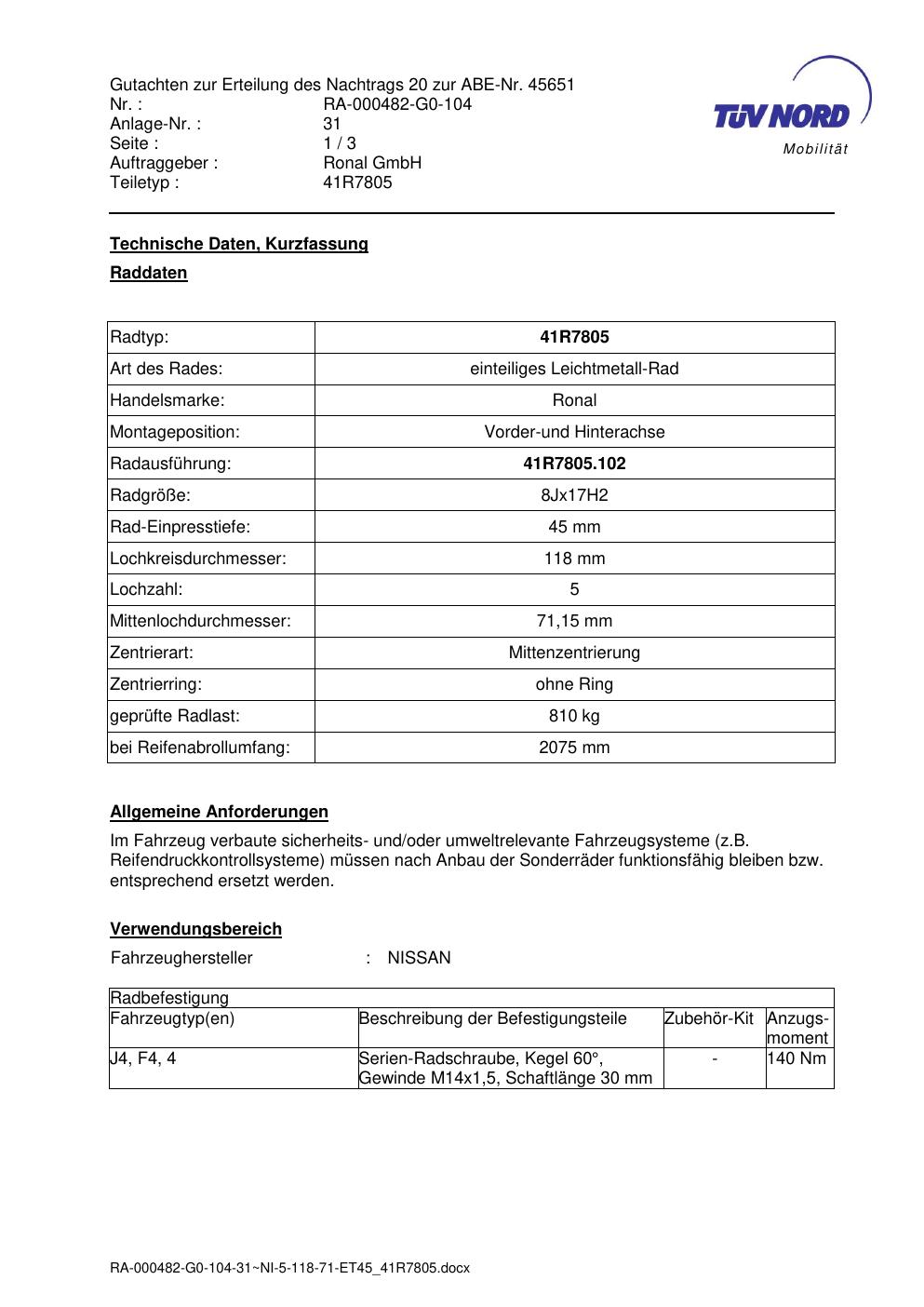 Dieses Gutachten (abe) bezieht sich auf die Alufelge brand-ronal 41R7805 in der Ausführung 8Jx17 ET 0, Mittenloch 0 mm (KBA 45651). Im PDF findest du typischerweise zulässige Reifengrößen, Auflagen/Anbauhinweise und – je nach Dokument – Hinweise zur Eintragung.