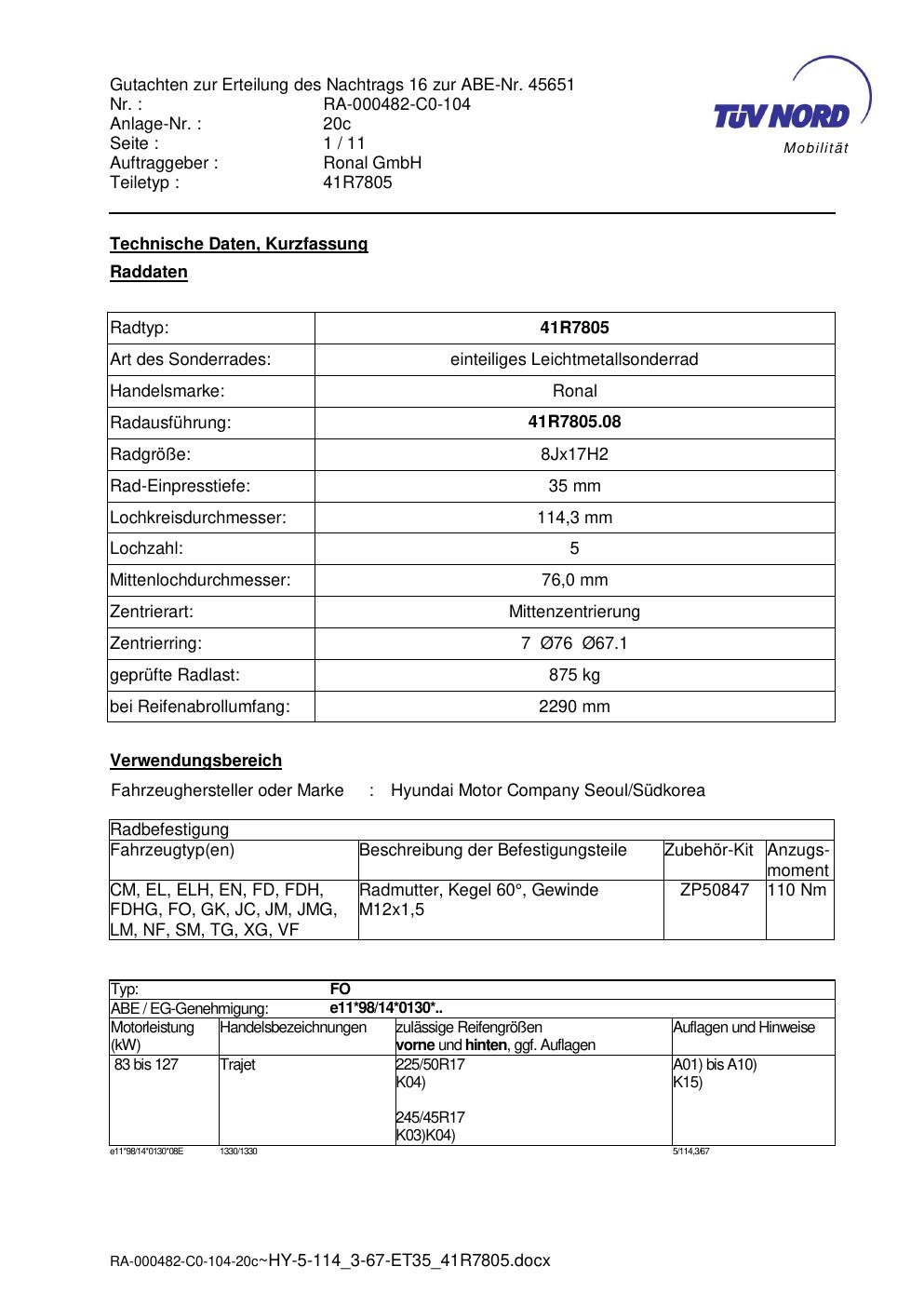 Dieses Gutachten (abe) bezieht sich auf die Alufelge brand-ronal 41R7805 in der Ausführung 8Jx17 ET 0, Mittenloch 0 mm (KBA 45651). Im PDF findest du typischerweise zulässige Reifengrößen, Auflagen/Anbauhinweise und – je nach Dokument – Hinweise zur Eintragung.