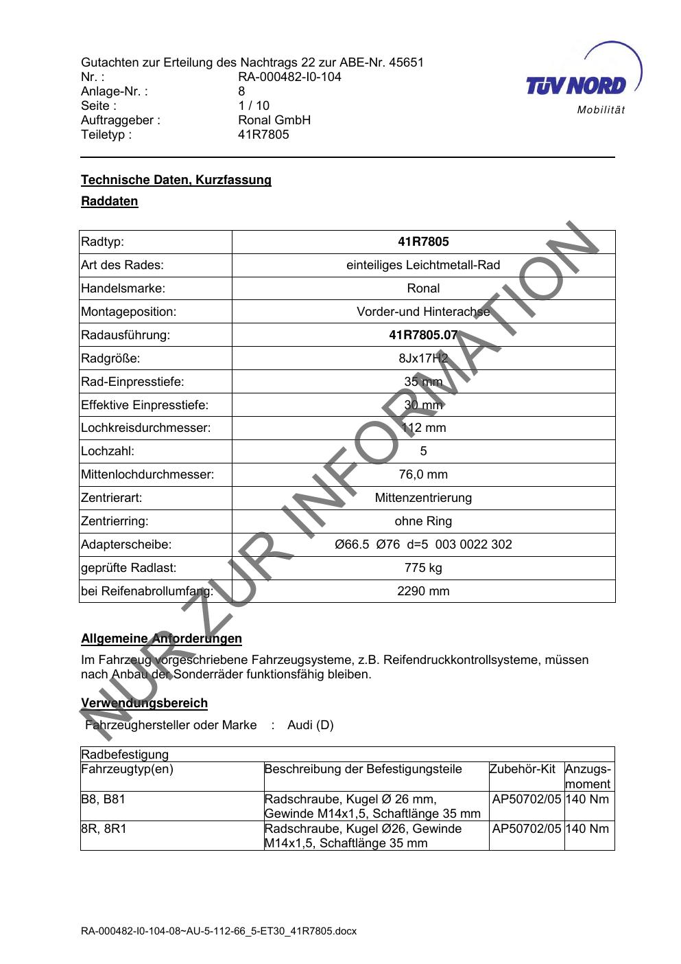Dieses Gutachten (abe) bezieht sich auf die Alufelge brand-ronal 41R7805 in der Ausführung 8Jx17 ET 0, Mittenloch 0 mm (KBA 45651). Im PDF findest du typischerweise zulässige Reifengrößen, Auflagen/Anbauhinweise und – je nach Dokument – Hinweise zur Eintragung.