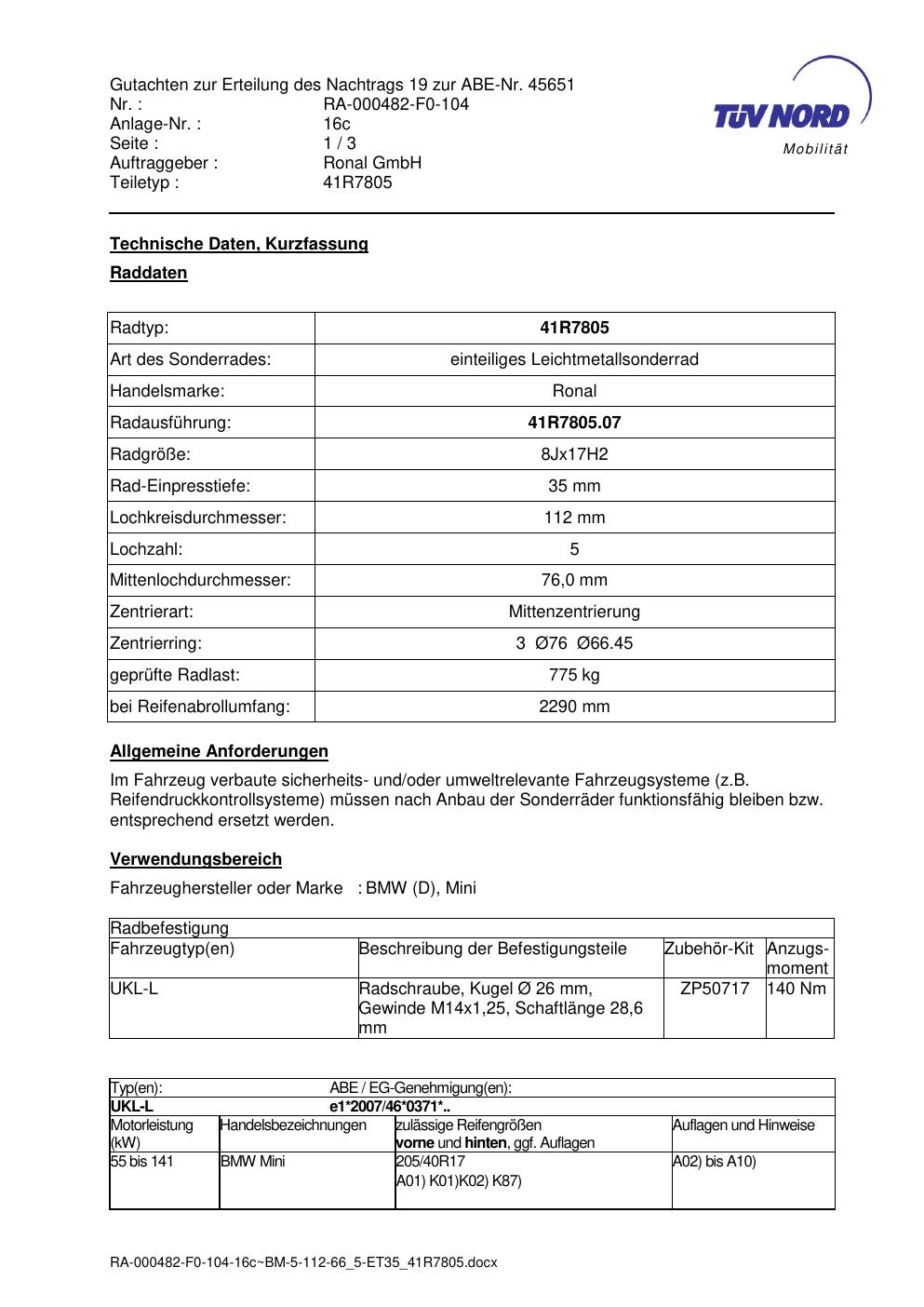 Dieses Gutachten (abe) bezieht sich auf die Alufelge brand-ronal 41R7805 in der Ausführung 8Jx17 ET 0, Mittenloch 0 mm (KBA 45651). Im PDF findest du typischerweise zulässige Reifengrößen, Auflagen/Anbauhinweise und – je nach Dokument – Hinweise zur Eintragung.