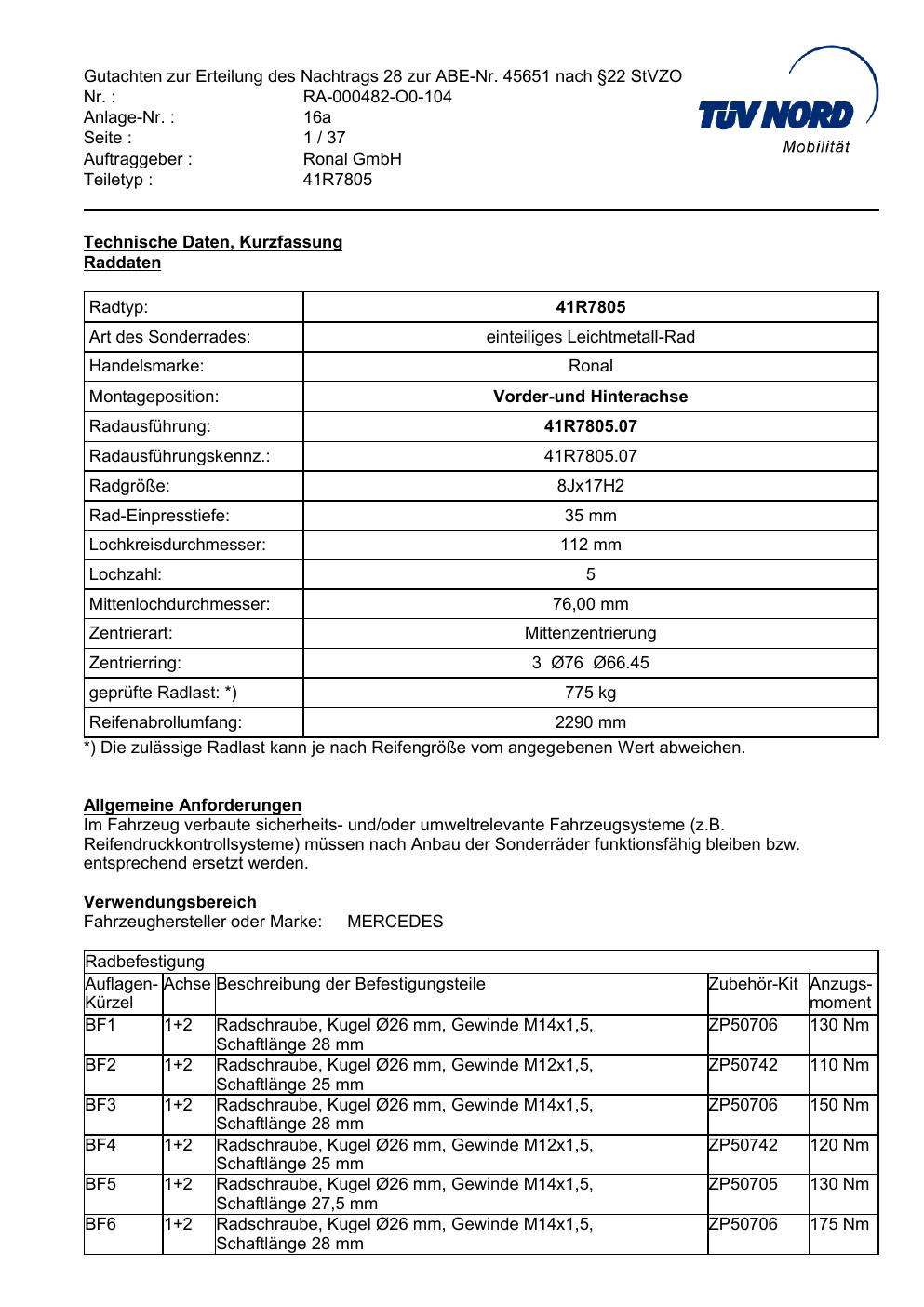 Dieses Gutachten (abe) bezieht sich auf die Alufelge brand-ronal 41R7805 in der Ausführung 8Jx17 ET 0, Mittenloch 0 mm (KBA 45651). Im PDF findest du typischerweise zulässige Reifengrößen, Auflagen/Anbauhinweise und – je nach Dokument – Hinweise zur Eintragung.