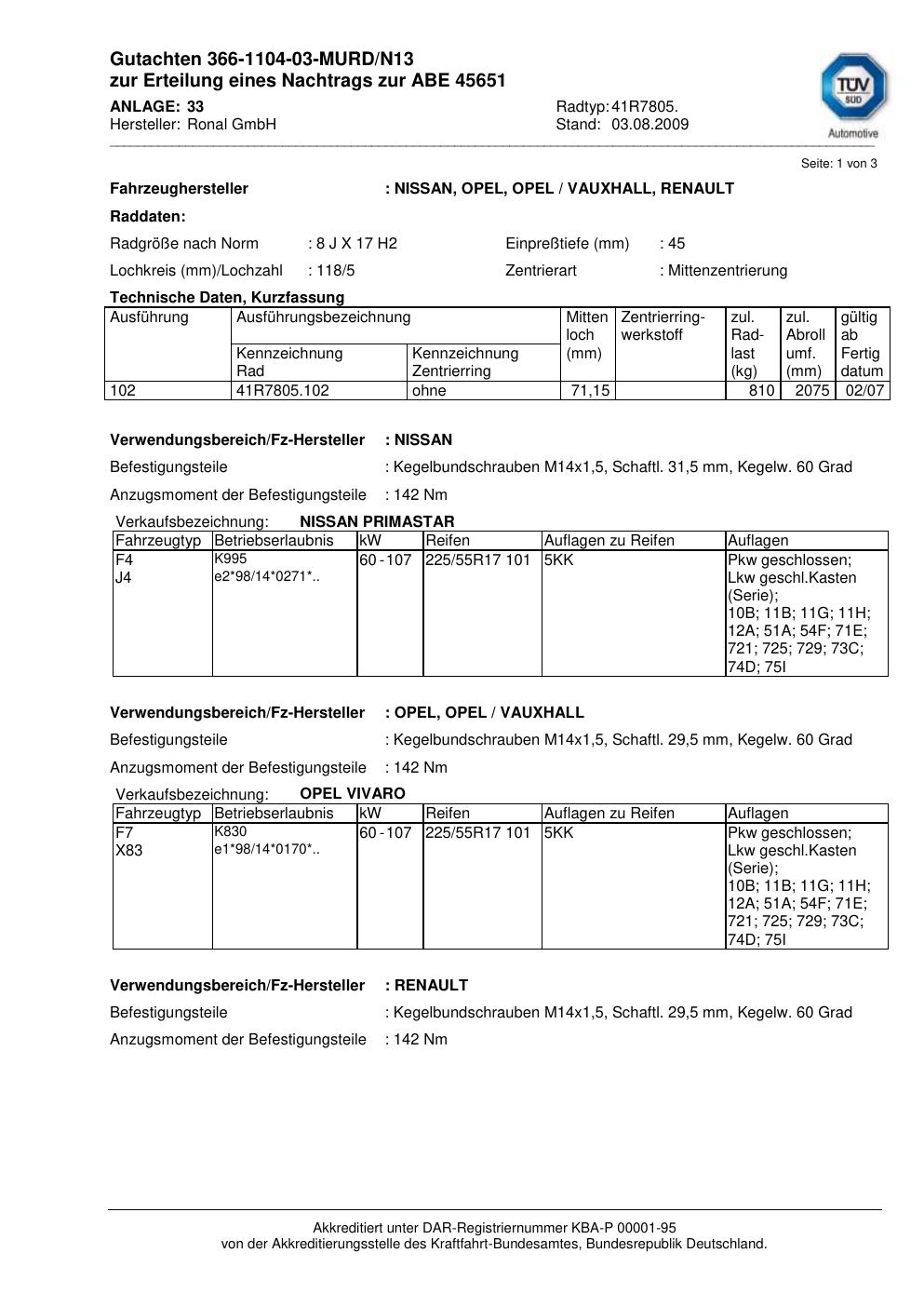 Dieses Gutachten (abe) bezieht sich auf die Alufelge Ronal 41R7805 in der Ausführung 8Jx17 ET 0, Mittenloch 0 mm (KBA 45651). Im PDF findest du typischerweise zulässige Reifengrößen, Auflagen/Anbauhinweise und – je nach Dokument – Hinweise zur Eintragung.