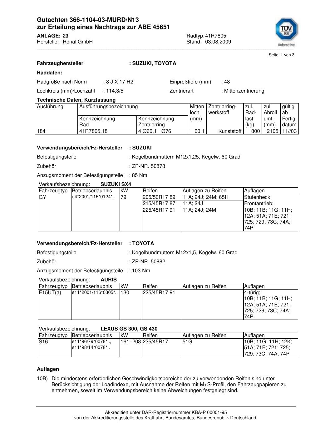 Dieses Gutachten (abe) bezieht sich auf die Alufelge Ronal 41R7805 in der Ausführung 8Jx17 ET 0, Mittenloch 0 mm (KBA 45651). Im PDF findest du typischerweise zulässige Reifengrößen, Auflagen/Anbauhinweise und – je nach Dokument – Hinweise zur Eintragung.
