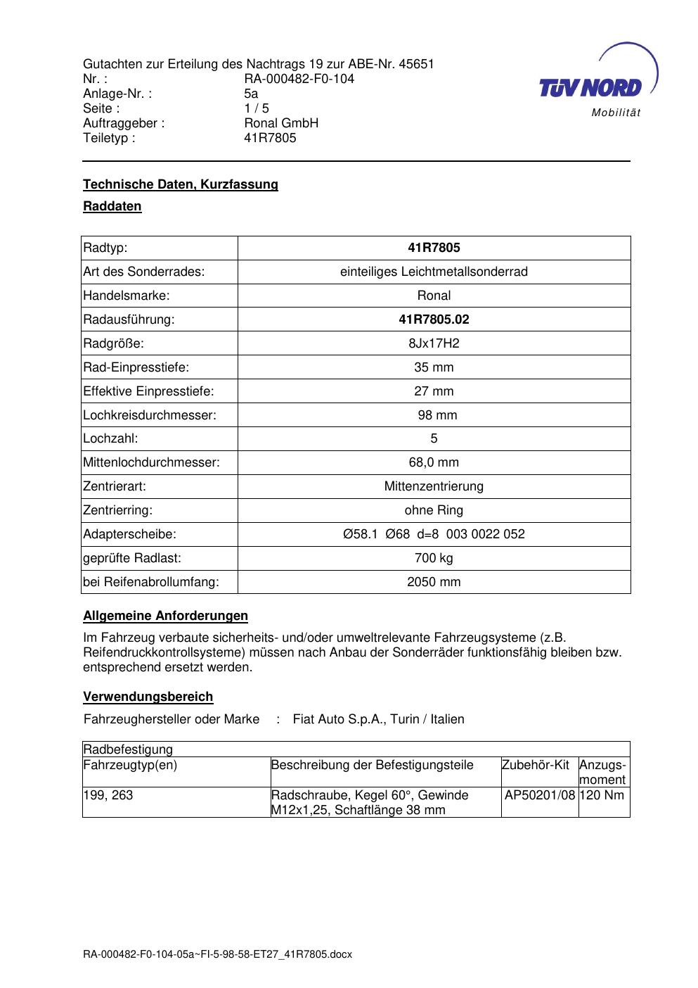 Dieses Gutachten (abe) bezieht sich auf die Alufelge brand-ronal 41R7805 in der Ausführung 8Jx17 ET 0, Mittenloch 0 mm (KBA 45651). Im PDF findest du typischerweise zulässige Reifengrößen, Auflagen/Anbauhinweise und – je nach Dokument – Hinweise zur Eintragung.